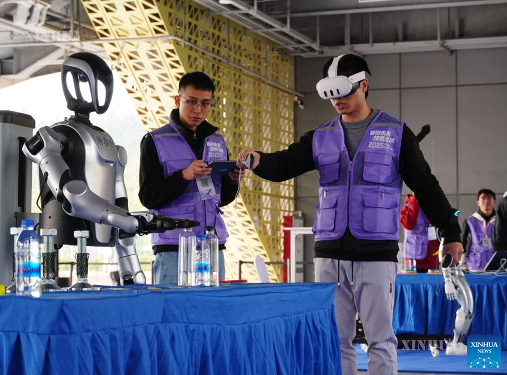 Contestants control a robot during a robot skills competition in Shenzhen, south China’s Guangdong Province, Dec. 27, 2025. (Xinhua/Wang Feng)