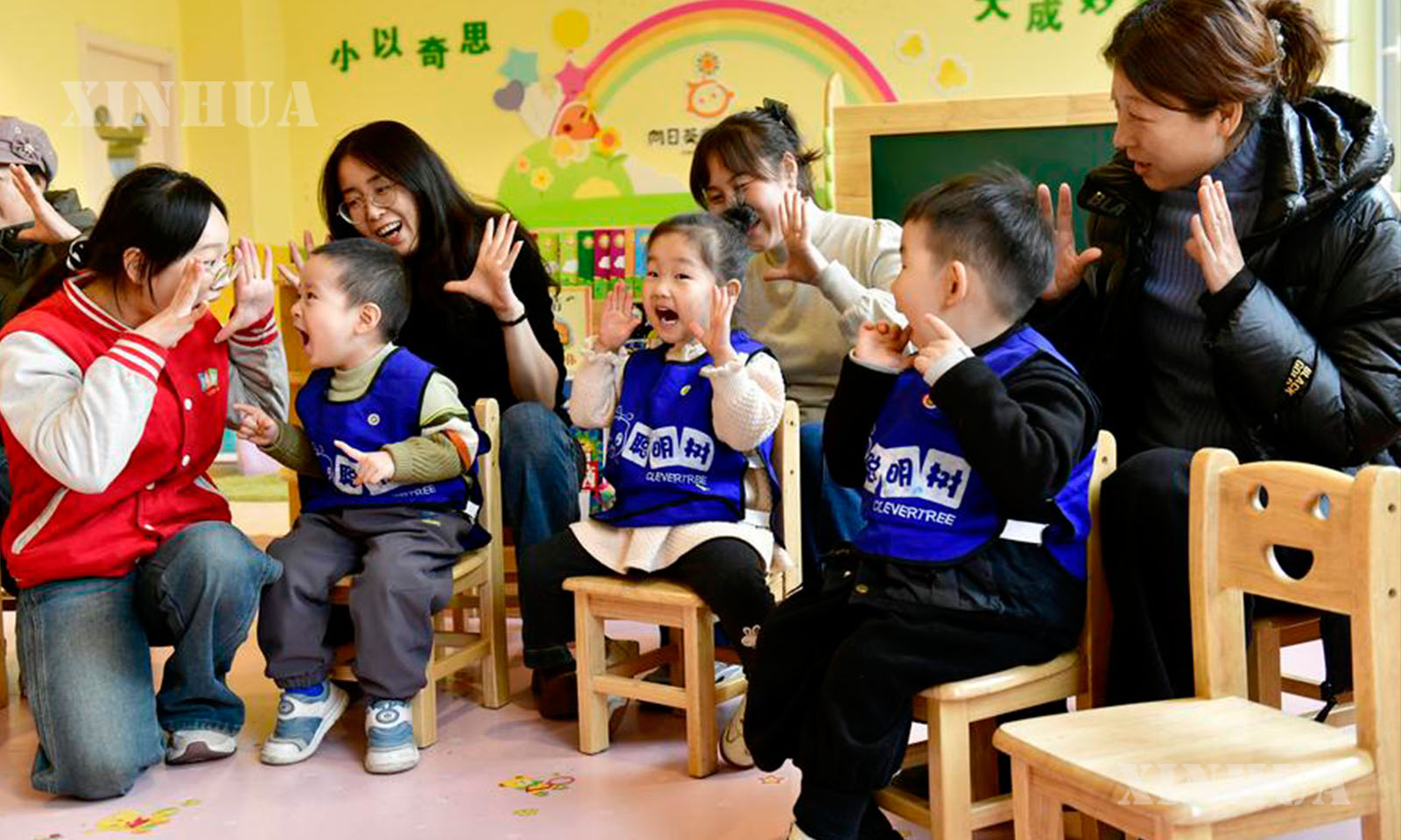 Teachers and parents play games with children at a kindergarten in Rizhao City, east China’s Shandong Province, Feb. 20, 2025. (Xinhua/Guo Xulei)