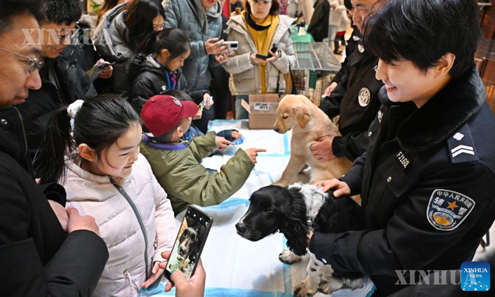 တရုတ်နိုင်ငံ အရှေ့ပိုင်း ဆန်းတုန်းပြည်နယ် ချင်းသောင်မြို့တွင် ရဲတပ်ဖွဲ့ဝင် ခွေးပေါက်လေးများနှင့် တွေ့ဆုံနေသူများကို ၂၀၂၆ ခုနှစ် ဇန်နဝါရီ ၁၀ ရက်က တွေ့ရစဉ် (ဆင်ဟွာ)