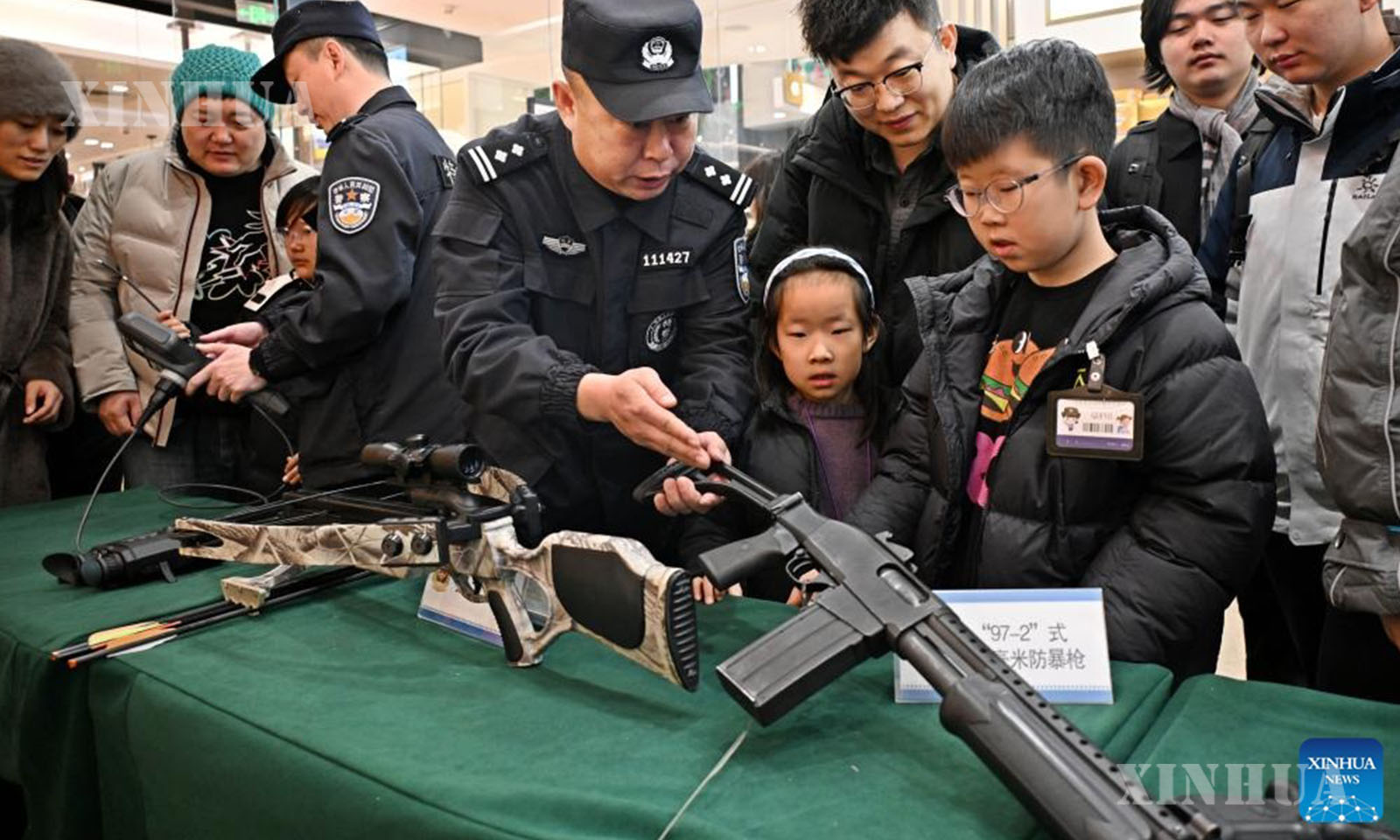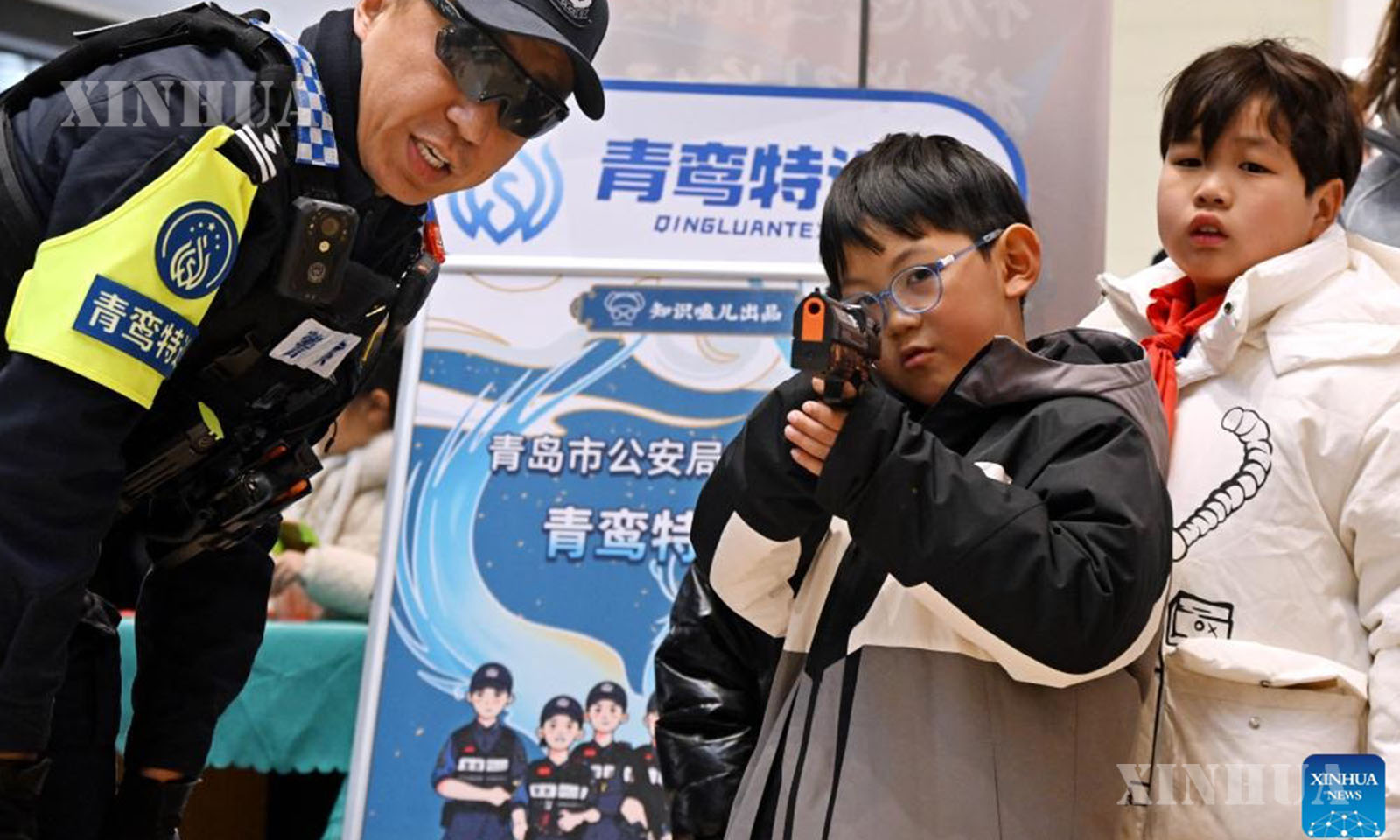Photo 3: A police officer introduces police equipment to citizens in Qingdao, east China’s Shandong Province, Jan. 10, 2026. (Xinhua/Li Ziheng)