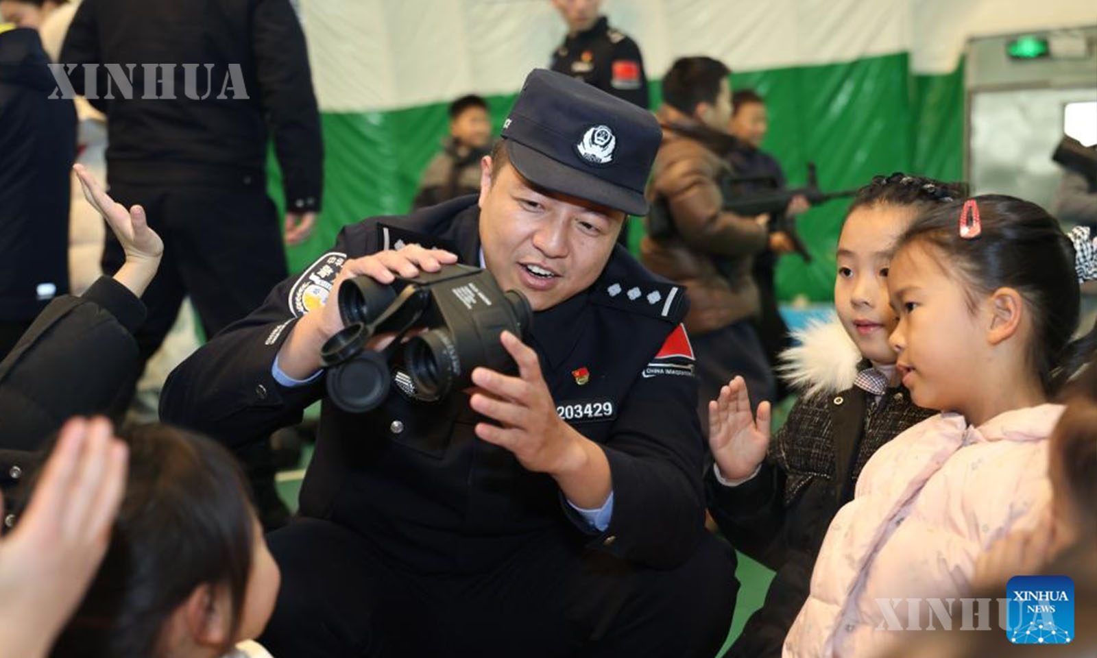 တရုတ်နိုင်ငံ အရှေ့ပိုင်း ကျန်းဆူးပြည်နယ် ဟွိုင်အန်းမြို့တွင် နယ်စပ်စစ်ဆေးရေးစခန်း၌ ရဲအရာရှိတစ်ဦးက ကလေးငယ်များကို ရဲတပ်ဖွဲ့သုံးကိရိယာ မိတ်ဆက်ရှင်းလင်းနေသည်ကို ၂၀၂၆ ခုနှစ် ဇန်နဝါရီ ၁၀ ရက်က တွေ့ရစဉ် (ဆင်ဟွာ)