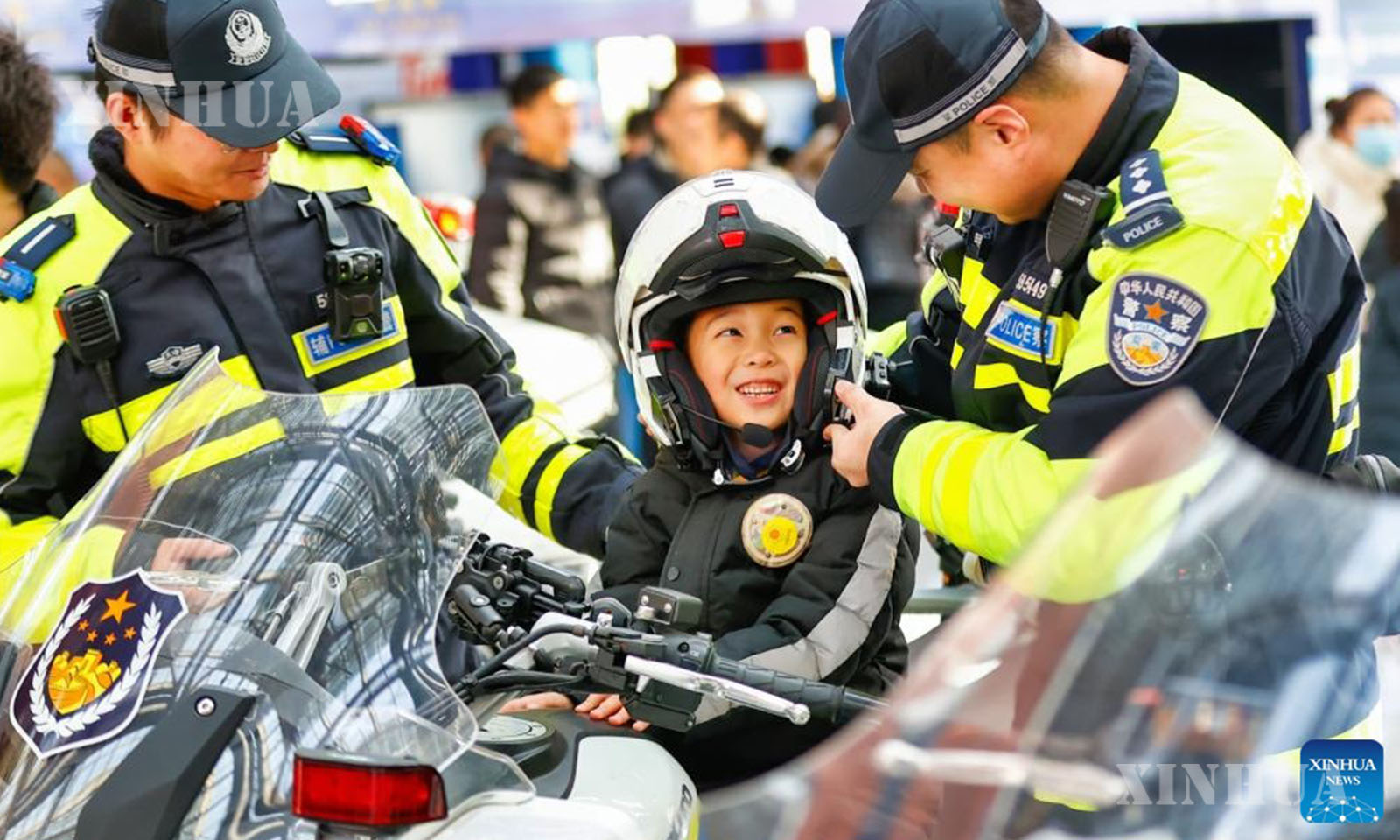 Photo 6: A kid tries a police motorcycle in north China’s Tianjin, Jan. 10, 2026. (Photo by Du Penghui/Xinhua)