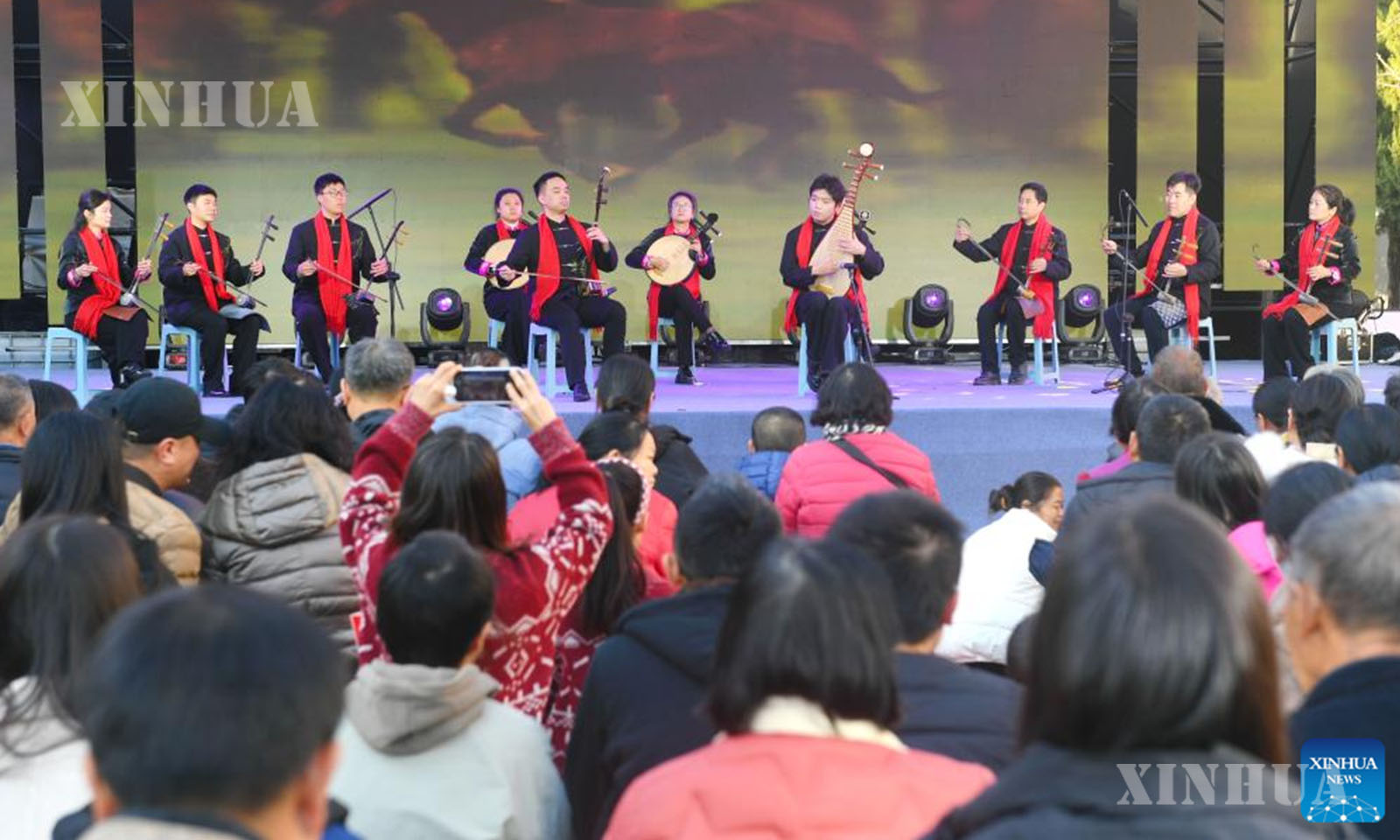 တရုတ်နိုင်ငံ အရှေ့တောင်ပိုင်း ဖူကျန့်ပြည်နယ် ဖူကျိုးမြို့ရှိ ရှီးဟူပန်းခြံ၌ အော်ပရာတင်ဆက်မှုအတွင်း နိုင်ငံသားများနှင့်အတူ အနုပညာရှင်များကို ၂၀၂၆ ခုနှစ် ဇန်နဝါရီ ၁၀ ရက်က တွေ့ရစဉ် (ဆင်ဟွာ)
