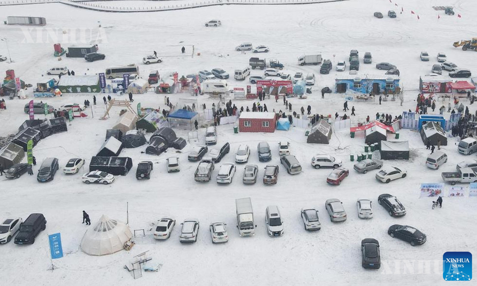 An aerial drone photo taken on Jan. 12, 2026 shows tourists visiting a village fair during a camping festival in Qiqihar City, northeast China’s Heilongjiang Province. (Photo by Li Nan/Xinhua)