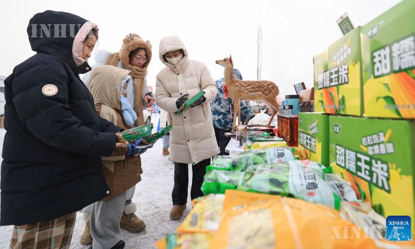 A vendor promotes local specialty products to tourists at a market of a camping festival in Qiqihar City, northeast China’s Heilongjiang Province, on Jan. 12, 2026. (Photo by Xu Shuai/Xinhua)