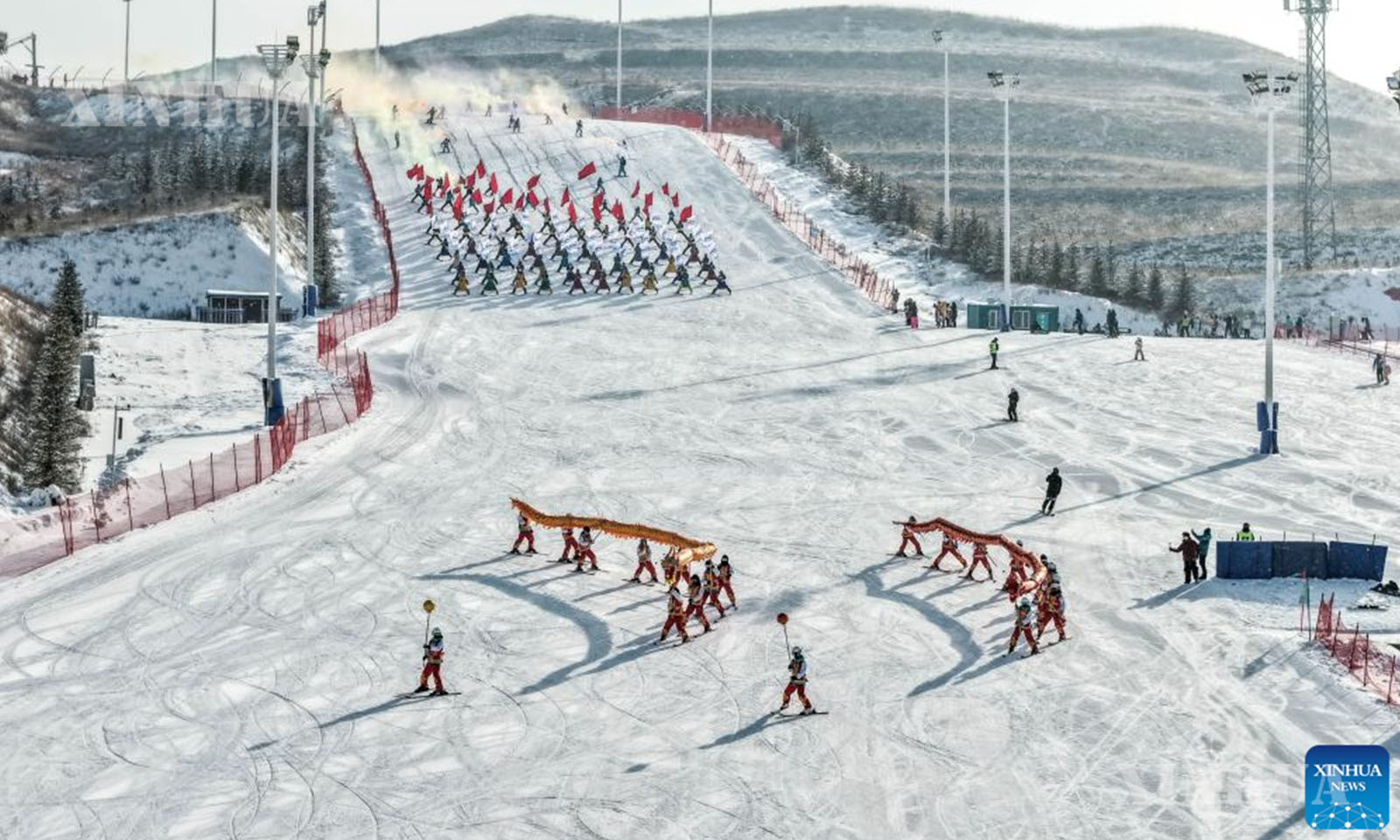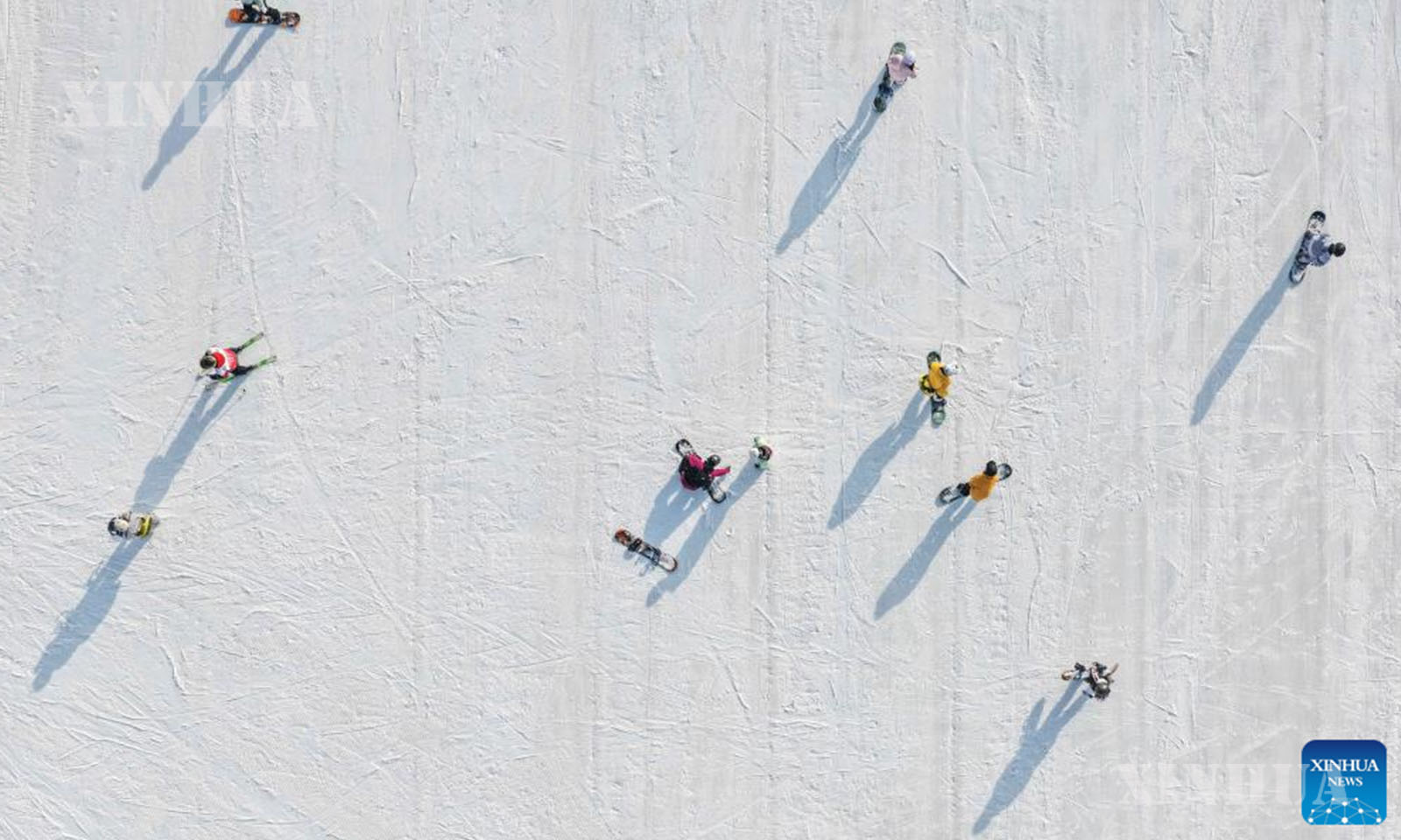 An aerial drone photo taken on Dec. 14, 2025 shows people skiing at a skiing resort in Hohhot, north China’s Inner Mongolia Autonomous Region. (Xinhua/Li Zhipeng)