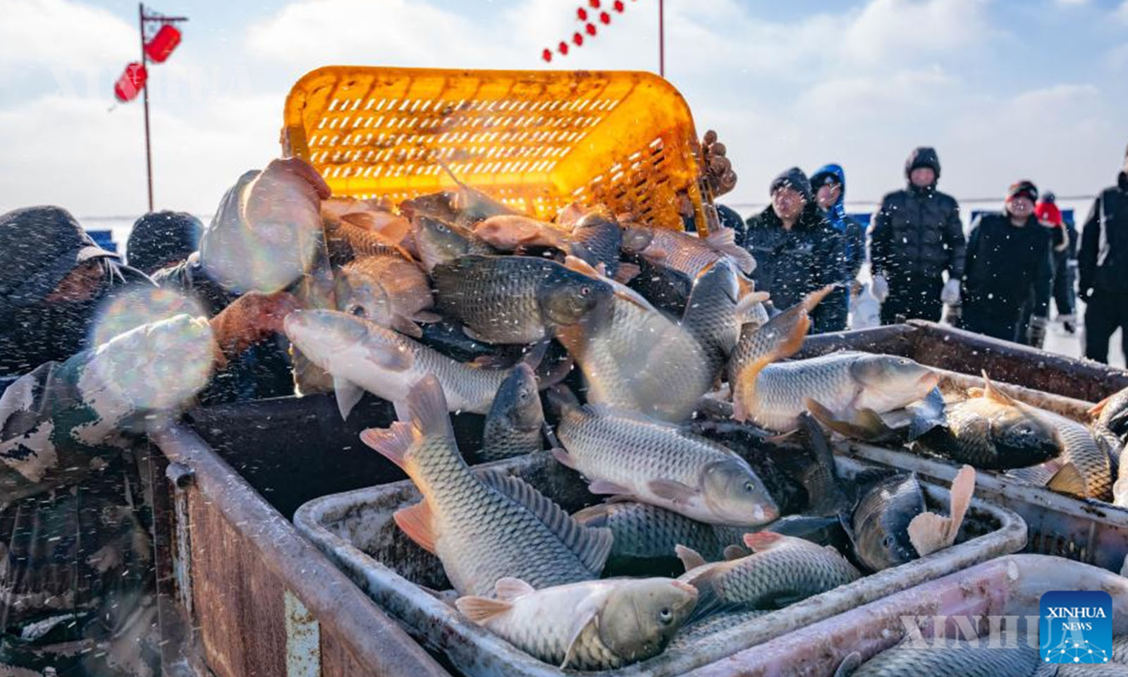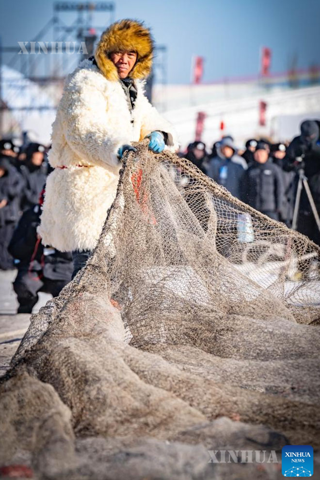 This photo taken on Jan. 10, 2026 shows fishermen loading fresh catch onto a truck during the fourth Hasuhai winter fishing festival in Hohhot, north China’s Inner Mongolia Autonomous Region. (Photo by Xu Ting/Xinhua)