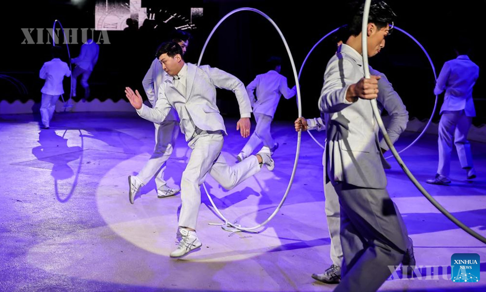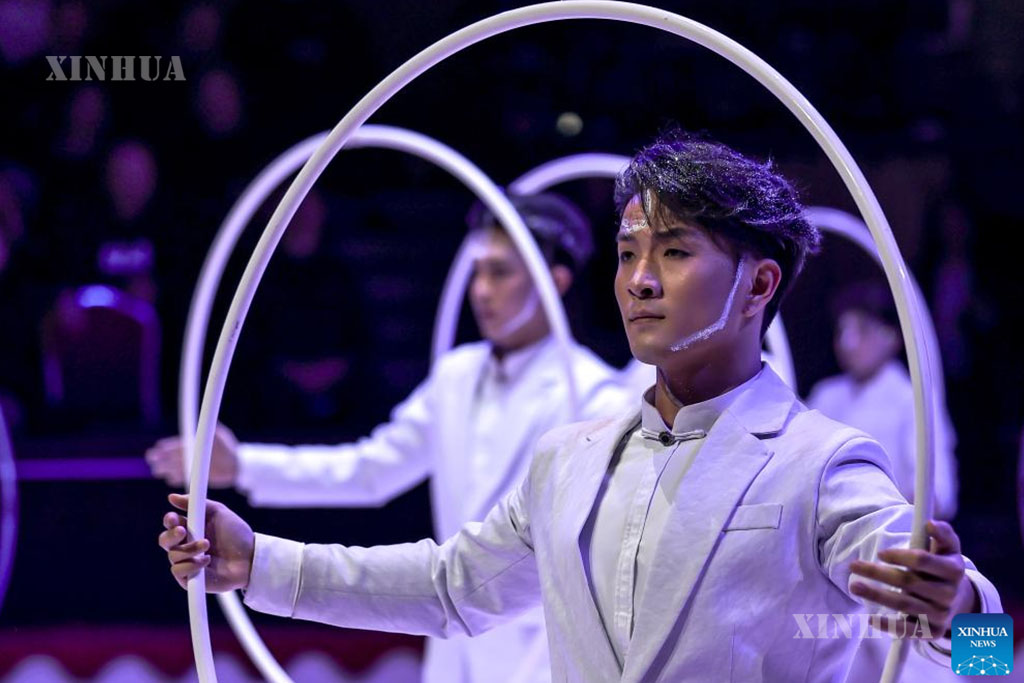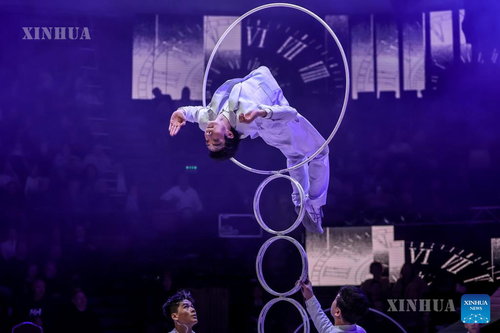 Members of the China National Acrobatic Troupe perform a hoop-diving act during the gala show of the 16th Budapest International Circus Festival in Budapest, Hungary, Jan. 12, 2026. (Photo by David Balogh/Xinhua)