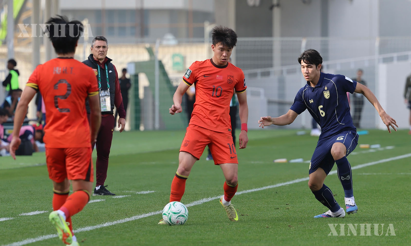 ဆော်ဒီအာရေဗျနိုင်ငံ ရီယတ်မြို့တွင် ၂၀၂၆ ခုနှစ် ဇန်နဝါရီ ၁၄ ရက်က တရုတ်အသင်းနှင့် ထိုင်းအသင်းတို့ ယှဉ်ပြိုင်ကစားသည့် ၂၀၂၆ ခုနှစ် အေအက်ဖ်စီ ယူ-၂၃ အာရှဖလားဘောလုံးပြိုင်ပွဲ အုပ်စုပွဲစဉ်၌ တရုတ်အသင်းမှ ဟဲ့ရိရန် (ယာ) ၏ ယှဉ်ပြိုင်ကစားဟန်ကို တွေ့ရစဉ် (ဆင်ဟွာ)
