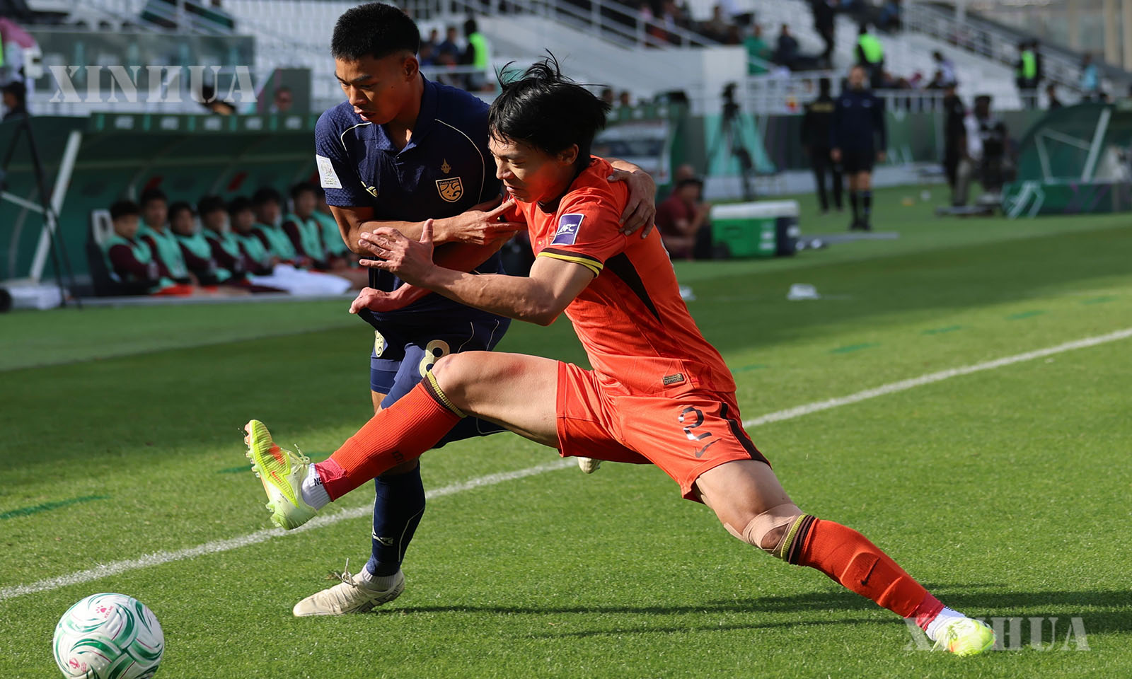 ဆော်ဒီအာရေဗျနိုင်ငံ ရီယတ်မြို့တွင် ၂၀၂၆ ခုနှစ် ဇန်နဝါရီ ၁၄ ရက်က တရုတ်အသင်းနှင့် ထိုင်းအသင်းတို့ ယှဉ်ပြိုင်ကစားသည့် ၂၀၂၆ ခုနှစ် အေအက်ဖ်စီ ယူ-၂၃ အာရှဖလားဘောလုံးပြိုင်ပွဲ အုပ်စုပွဲစဉ်၌ တရုတ်အသင်းမှ ဟူဟယ်ထောင်း (ယာ) နှင့် ထိုင်းအသင်းမှ ချာဝမ်ဝစ် ဆီအာလောင်တို့ ယှဉ်ပြိုင်ကစားနေပုံကို တွေ့ရစဉ် (ဆင်ဟွာ)