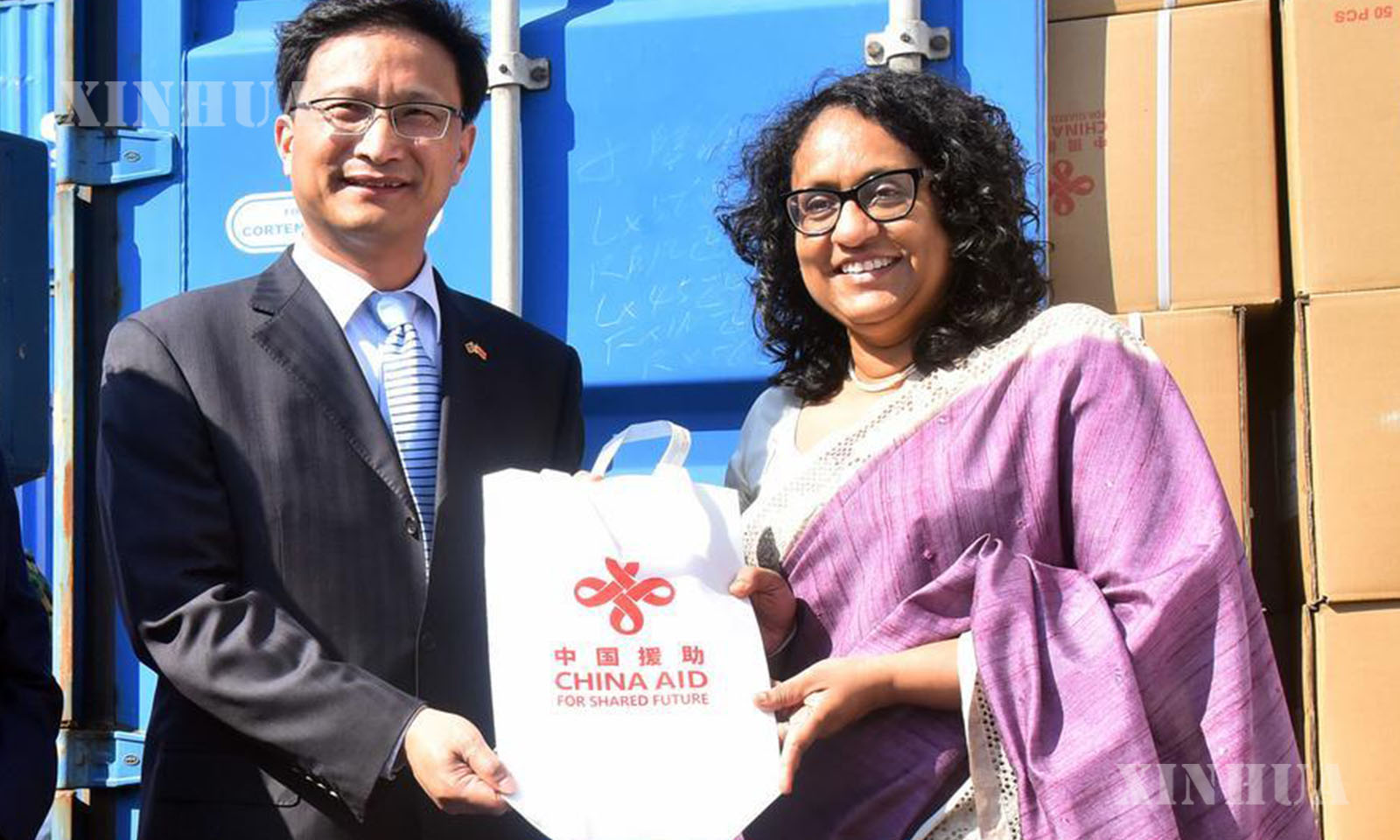 This picture shows Chinese Ambassador to Sri Lanka Qi Zhenhong and Sri Lankan Prime Minister Harini Amarasuriya participating in a ceremony marking Sri Lanka’s reception of a shipment of school uniform fabric from China in Colombo, Sri Lanka, Jan. 13, 2026. (Photo by Gayan Sameera/Xinhua)