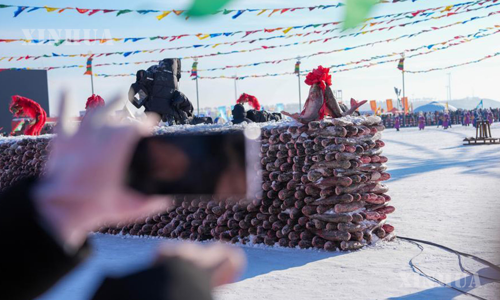 Photo 1: This photo taken on Jan. 8, 2026 shows a tourist taking a photo of a wall made of fish during the opening ceremony of the 24th Chagan Lake Ice and Snow Fishing and Hunting Cultural Tourism Festival in Songyuan, northeast China’s Jilin Province. (Xinhua/Yan Linyun)