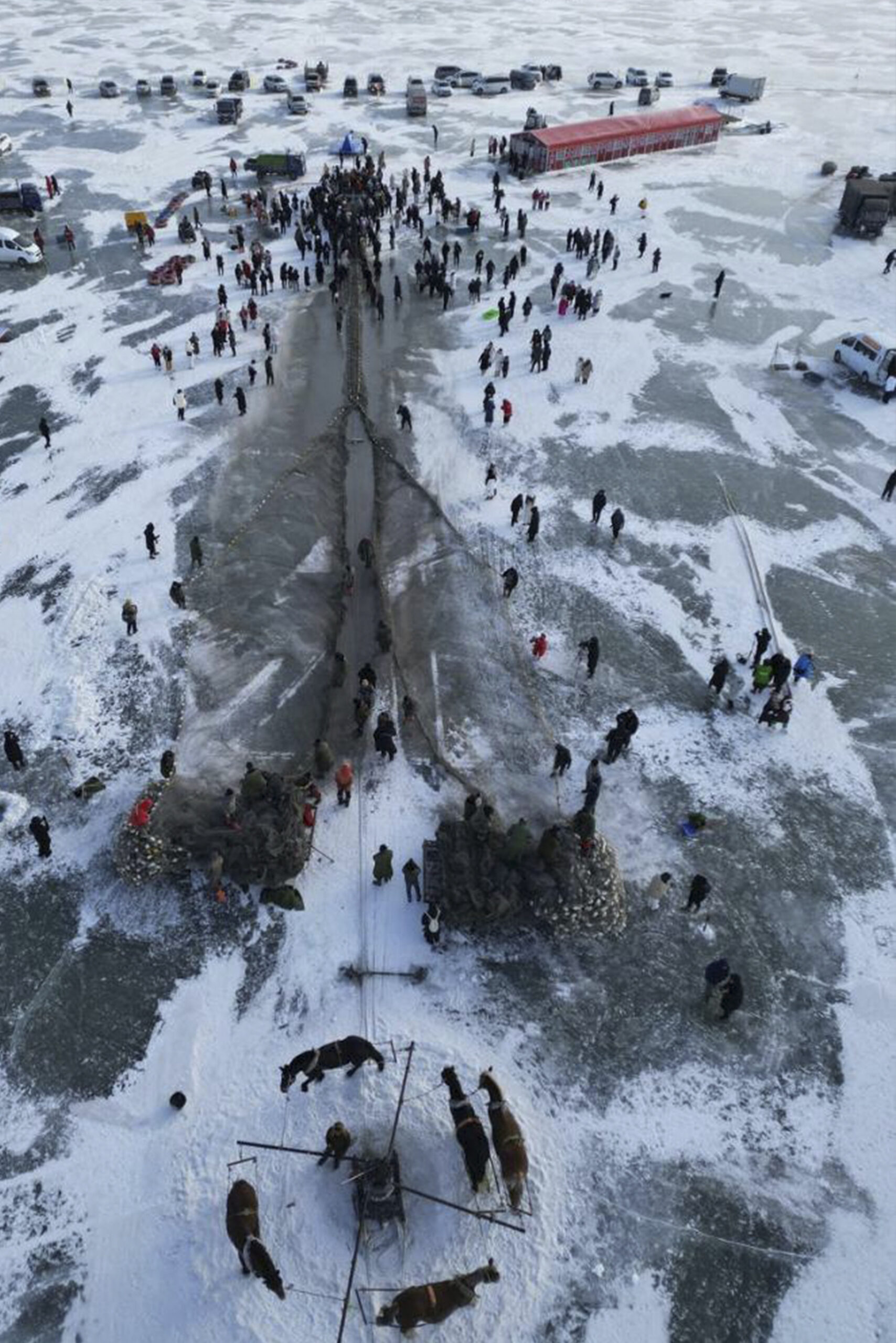 To thunderous drumbeats, horses pulled winches at the icy expanse of Chagan Lake, hauling up a kilometer-long net from beneath the frozen surface.