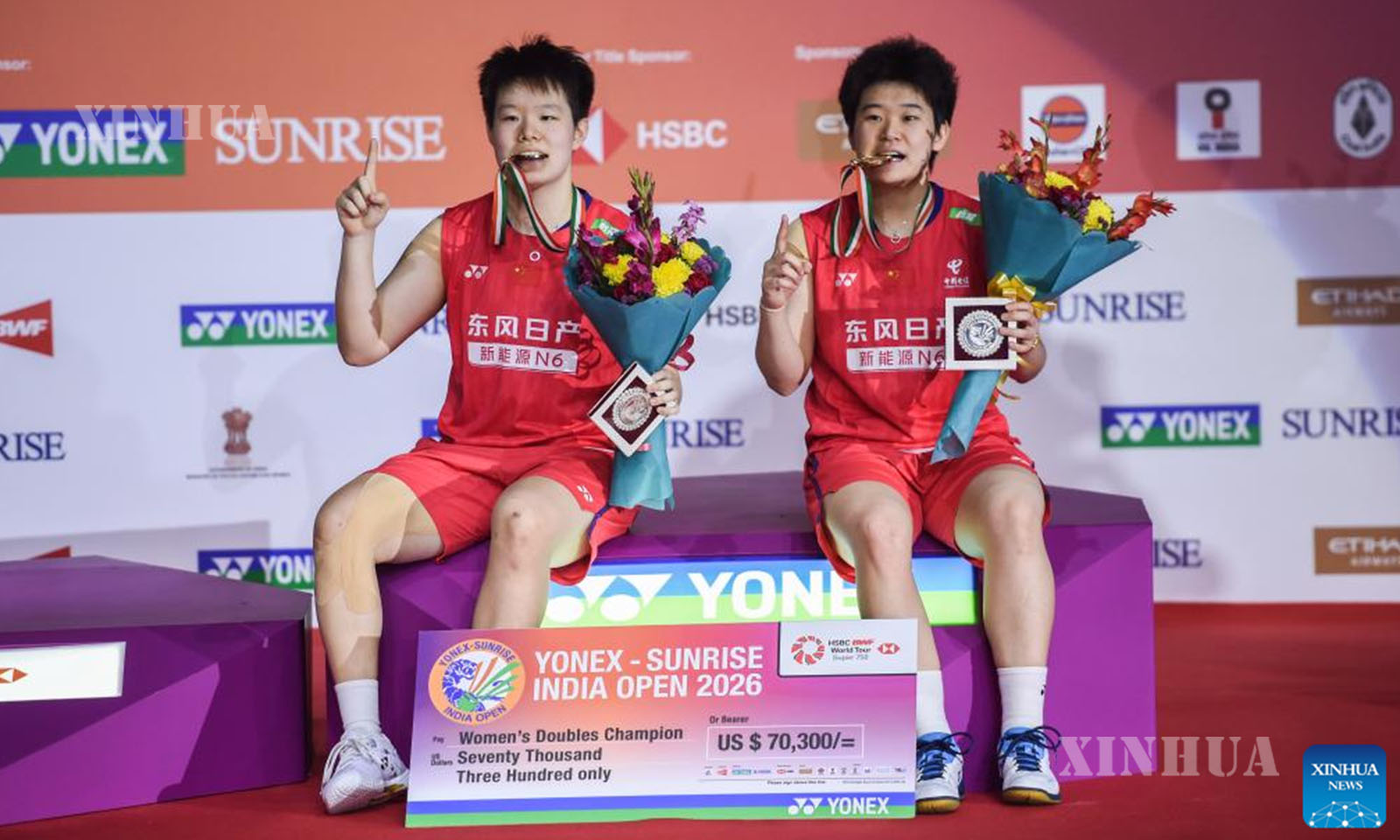 Winner Liu Shengshu (L)/Tan Ning of China celebrate during the awarding ceremony after the women’s doubles final between Liu Shengshu/Tan Ning of China and Fukushima Yuki/Matsumoto Mayu of Japan at India Open 2026 in New Delhi, India, Jan. 18, 2026. (Xinhua/Javed Dar)