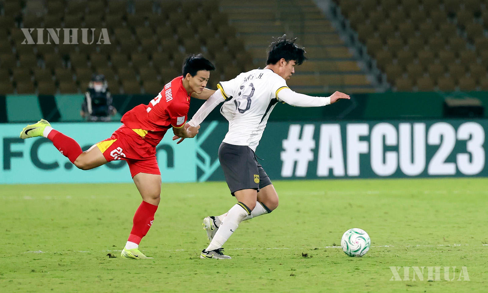 ဆော်ဒီအာရေဗျနိုင်ငံ ဂျက်ဒါမြို့တွင် ၂၀၂၆ ခုနှစ် ဇန်နဝါရီ ၂၀ ရက်က တရုတ်အသင်းနှင့် ဗီယက်နမ်အသင်းတို့ ယှဉ်ပြိုင်ကစားခဲ့သည့် ၂၀၂၆ အေအက်ဖ်စီ ယူ-၂၃ အာရှဖလားဘောလုံးပြိုင်ပွဲ ဆီမီးဖိုင်နယ်ပွဲစဉ်၌ တရုတ်အသင်းမှ ဝမ်ပေါ်ဟောက် (ယာ) နှင့် ဗီယက်နမ်အသင်းမှ ထန်ညန်ငုယင်တို့၏ ယှဉ်ပြိုင်ကစားဟန်ကို တွေ့ရစဉ် (ဆင်ဟွာ)