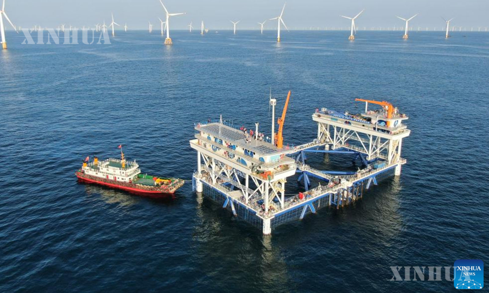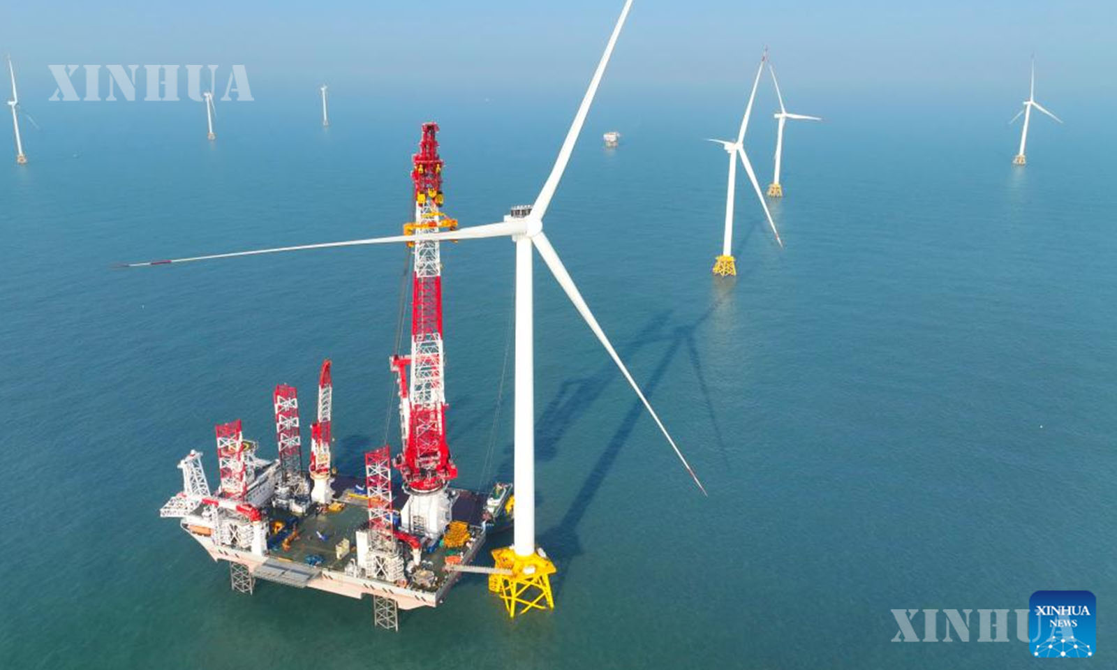 တရုတ်နိုင်ငံ အရှေ့တောင်ပိုင်း ဖူကျန့်ပြည်နယ်၏ ကမ်းရိုးတန်းရေပိုင်နက်ရှိ ၂၀ မဂ္ဂါဝပ် ကမ်းလွန်လေတာဘိုင်လုပ်ကွက် တည်ဆောက်ရေးနေရာကို ၂၀၂၆ ခုနှစ် ဇန်နဝါရီ ၁၃ ရက်က တွေ့ရစဉ် (ဆင်ဟွာ)