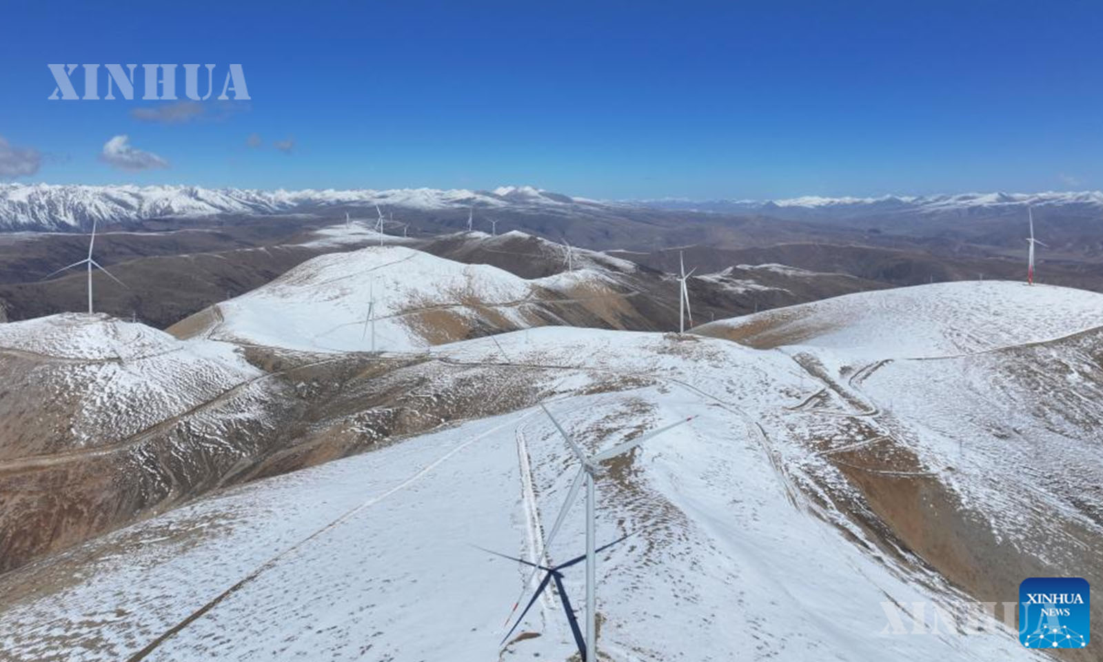 တရုတ်နိုင်ငံ အနောက်တောင်ပိုင်း ရှီးဇန့်ကိုယ်ပိုင်အုပ်ချုပ်ခွင့်ရဒေသ Baxoi ခရိုင်ရှိ ပင်လယ်ရေမျက်နှာပြင်ထက် အမြင့်ပေ ၅,၃၀၅ မီတာ၌ရှိသော အမြင့်ဆုံး nacelle ရှိသည့် လေစွမ်းအင်စီမံကိန်းကို ၂၀၂၄ ခုနှစ် အောက်တိုဘာ ၂၂ ရက်က တွေ့ရစဉ် ဆင်ဟွာ)
