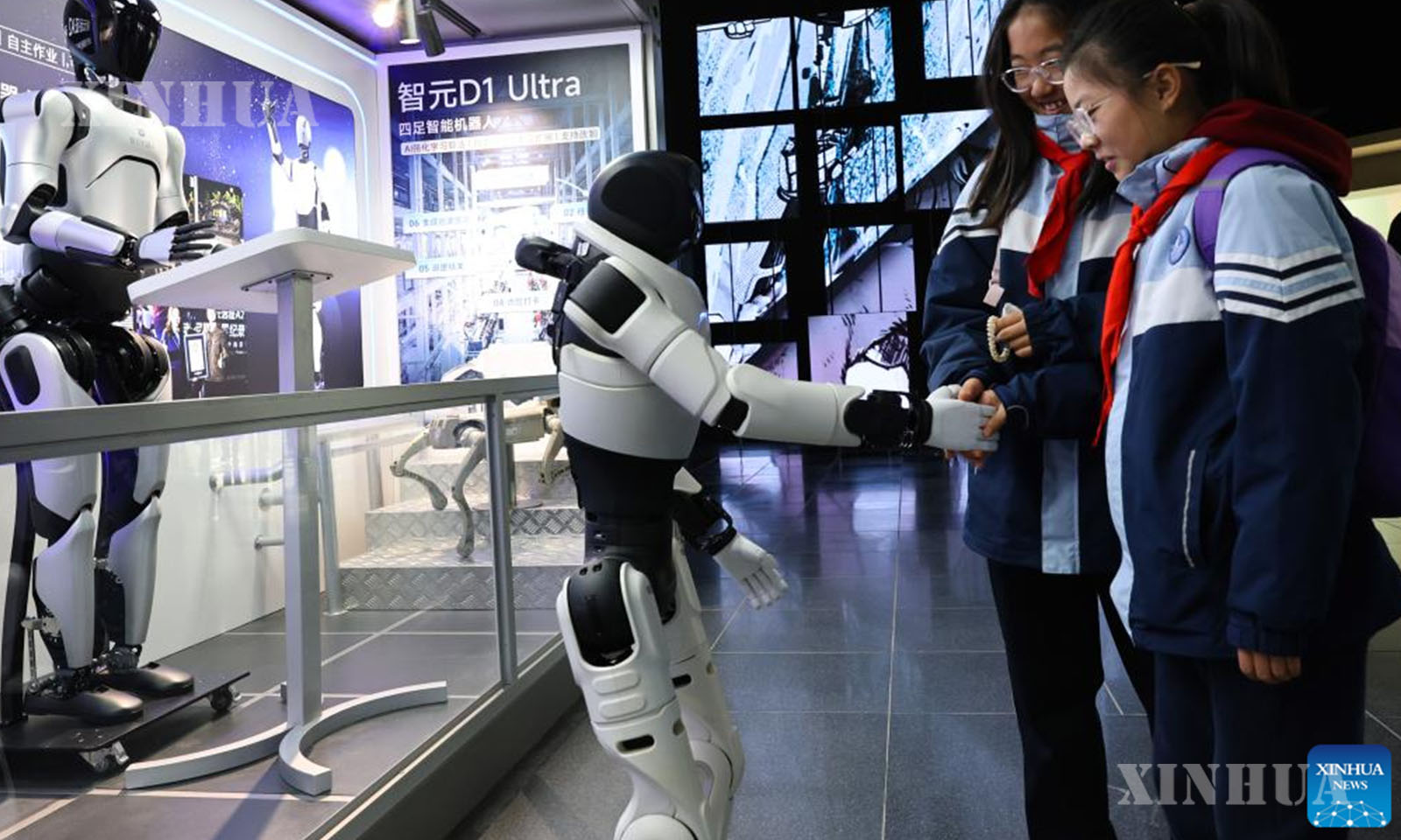 Visitors shake hands with a robot at the Shanghai Science & Technology Museum in Shanghai, east China, Jan. 27, 2026. (Xinhua/Fang Zhe)