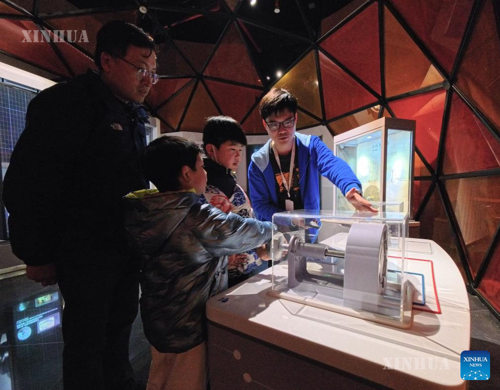 A staff member (1st R) guides the visitors to experience a science game at the Shanghai Science & Technology Museum in Shanghai, east China, Jan. 27, 2026. (Xinhua/Fang Zhe)