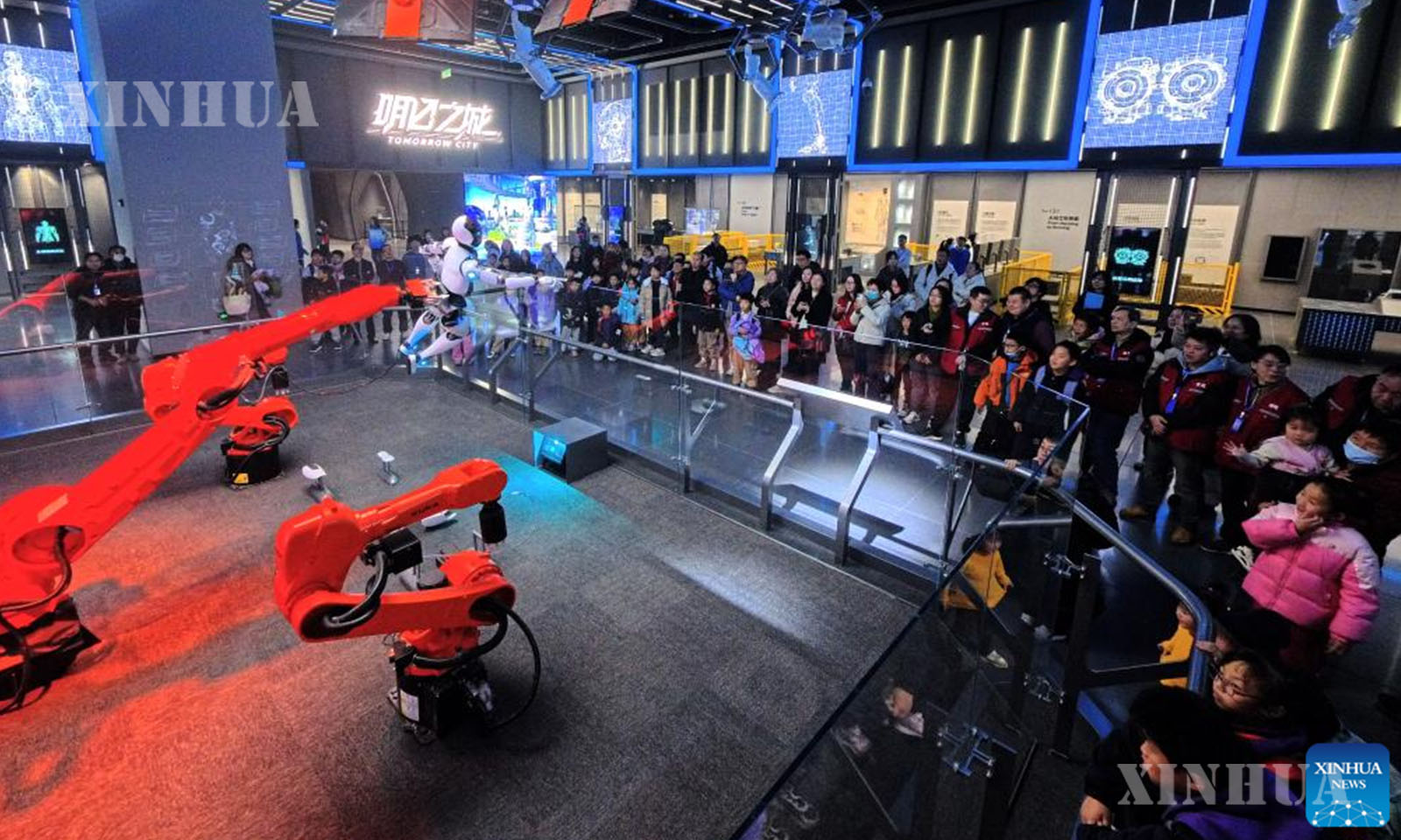တရုတ်နိုင်ငံ အရှေ့ပိုင်း ရှန်ဟိုင်းမြို့ရှိ ရှန်ဟိုင်းသိပ္ပံနှင့်နည်းပညာပြတိုက်၌ စက်ရုပ်နှင့် လက်ဆွဲနှုတ်ဆက်နေသည့် ဧည့်သည်များကို ၂၀၂၆ ခုနှစ် ဇန်နဝါရီ ၂၇ ရက်က တွေ့ရစဉ် (ဆင်ဟွာ)