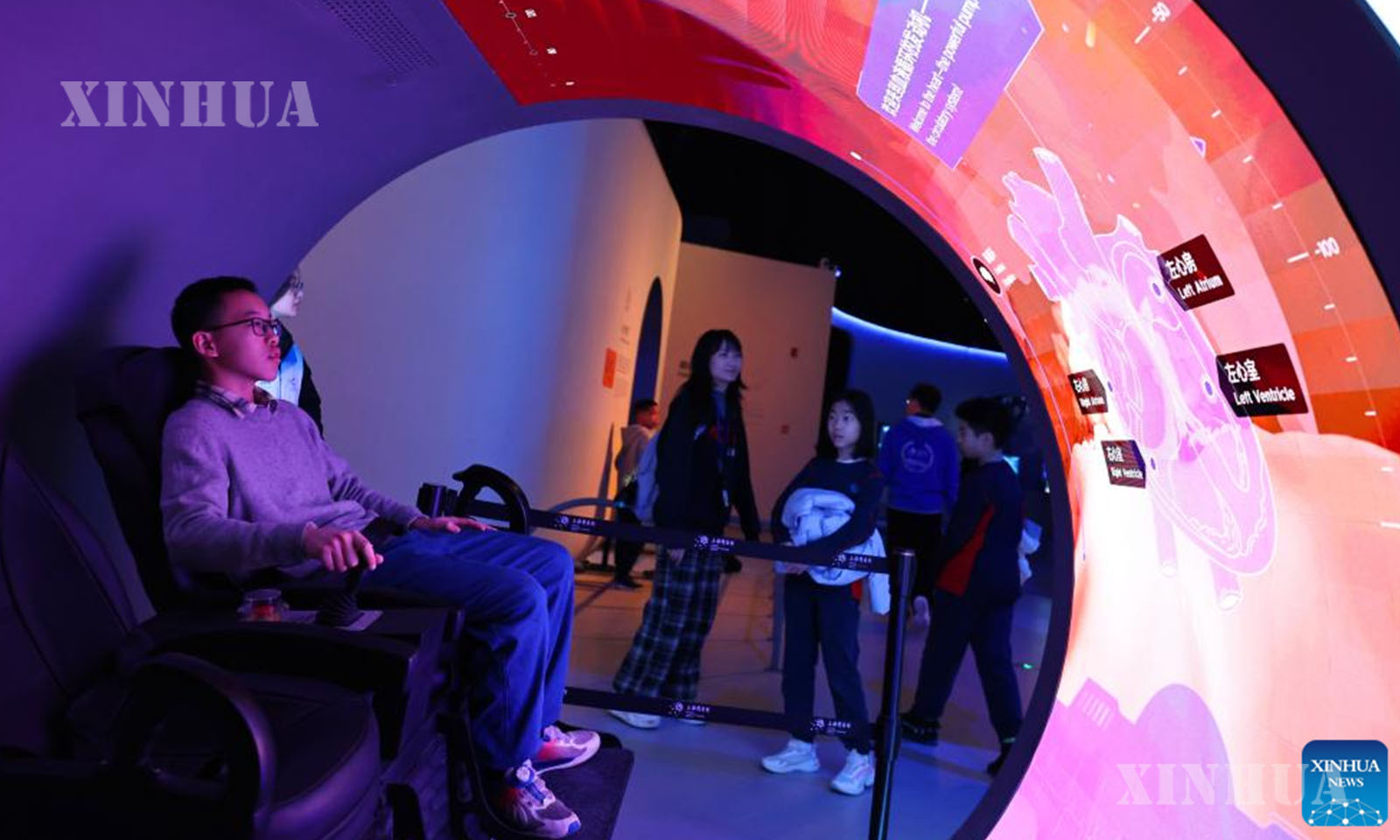 တရုတ်နိုင်ငံ အရှေ့ပိုင်း ရှန်ဟိုင်းမြို့ရှိ ရှန်ဟိုင်းသိပ္ပံနှင့်နည်းပညာပြတိုက်၌ သိပ္ပံဂိမ်းတစ်ခုအား တွေ့ကြုံခံစားကြည့်ရန် ဧည့်သည်များအား လမ်းညွှန်ပေးနေသည့် ဝန်ထမ်းတစ်ဦး (ပထမယာဘက်) ကို ၂၀၂၆ ခုနှစ် ဇန်နဝါရီ ၂၇ ရက်က တွေ့ရစဉ် (ဆင်ဟွာ)
