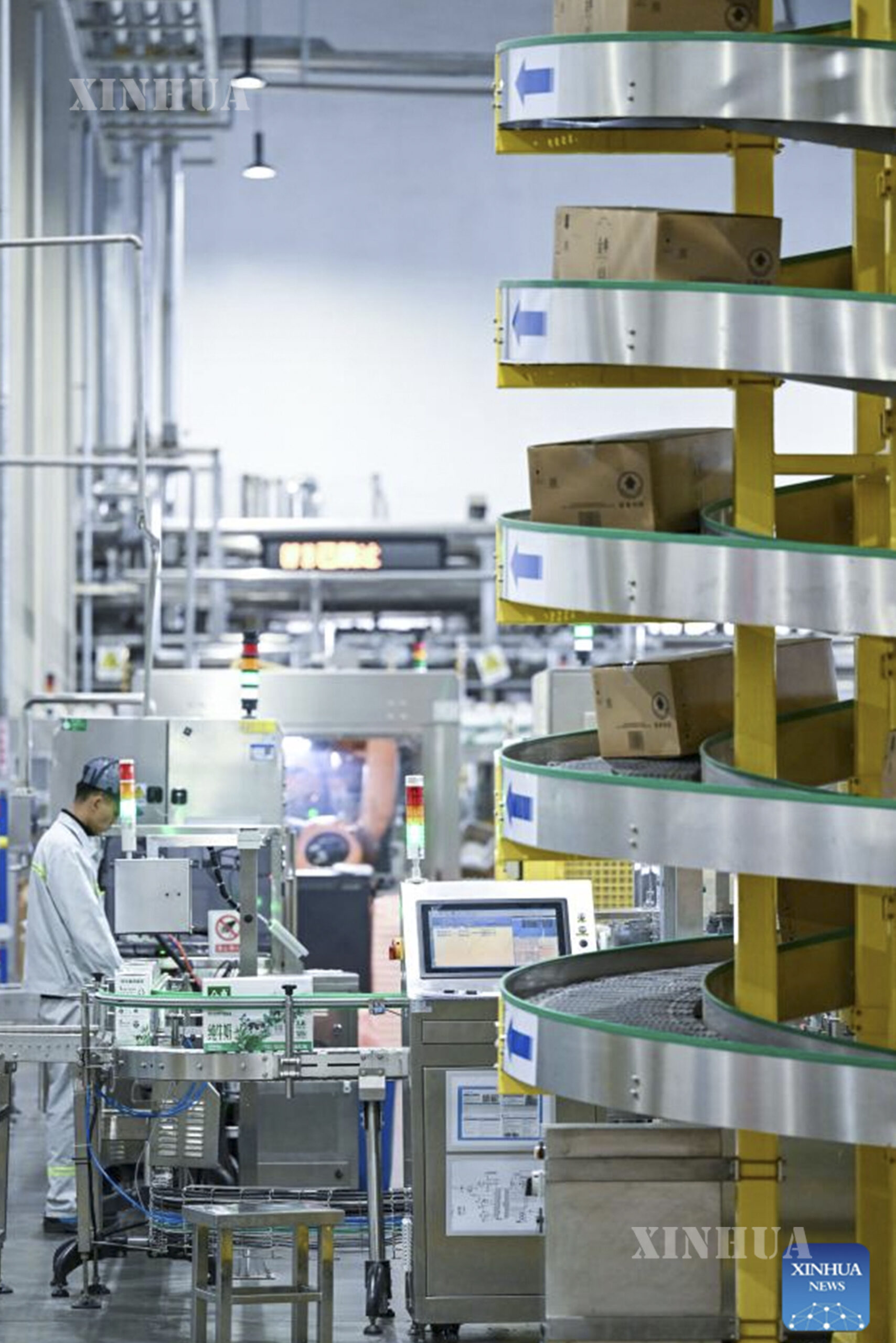 တရုတ်နိုင်ငံ နင်းရှဟွေကိုယ်ပိုင်အုပ်ချုပ်ခွင့်ရဒေသ ဝူကျုံးမြို့ရှိ ရီးလိ နို့ထွက်ပစ္စည်းစက်ရုံ၏ ထုပ်ပိုးရေးအလုပ်ရုံ၌ ကုန်ပစ္စည်းများ ပို့ဆောင်နေသည့် အလိုအလျောက်စနစ်သုံး ဝန်ပင့်ယာဉ်ကို ၂၀၂၆ ခုနှစ် ဇန်နဝါရီ ၂၇ ရက်က တွေ့ရစဉ် (ဆင်ဟွာ)