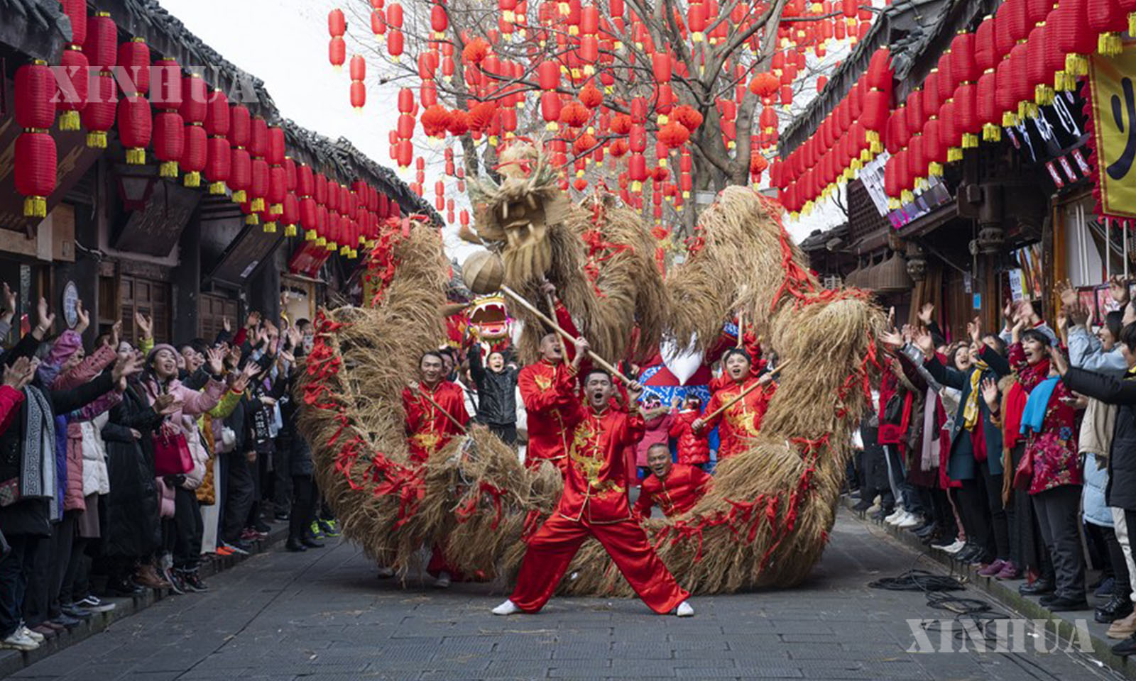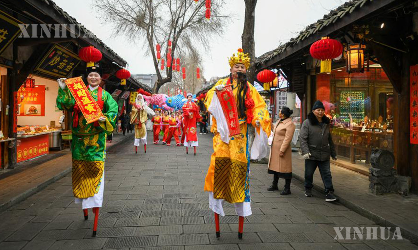 This photo taken on Jan. 7, 2025 shows a parade performance of intangible cultural heritage in Langzhong ancient town of Langzhong City, southwest China’s Sichuan Province. (Xinhua/Xu Bingjie)