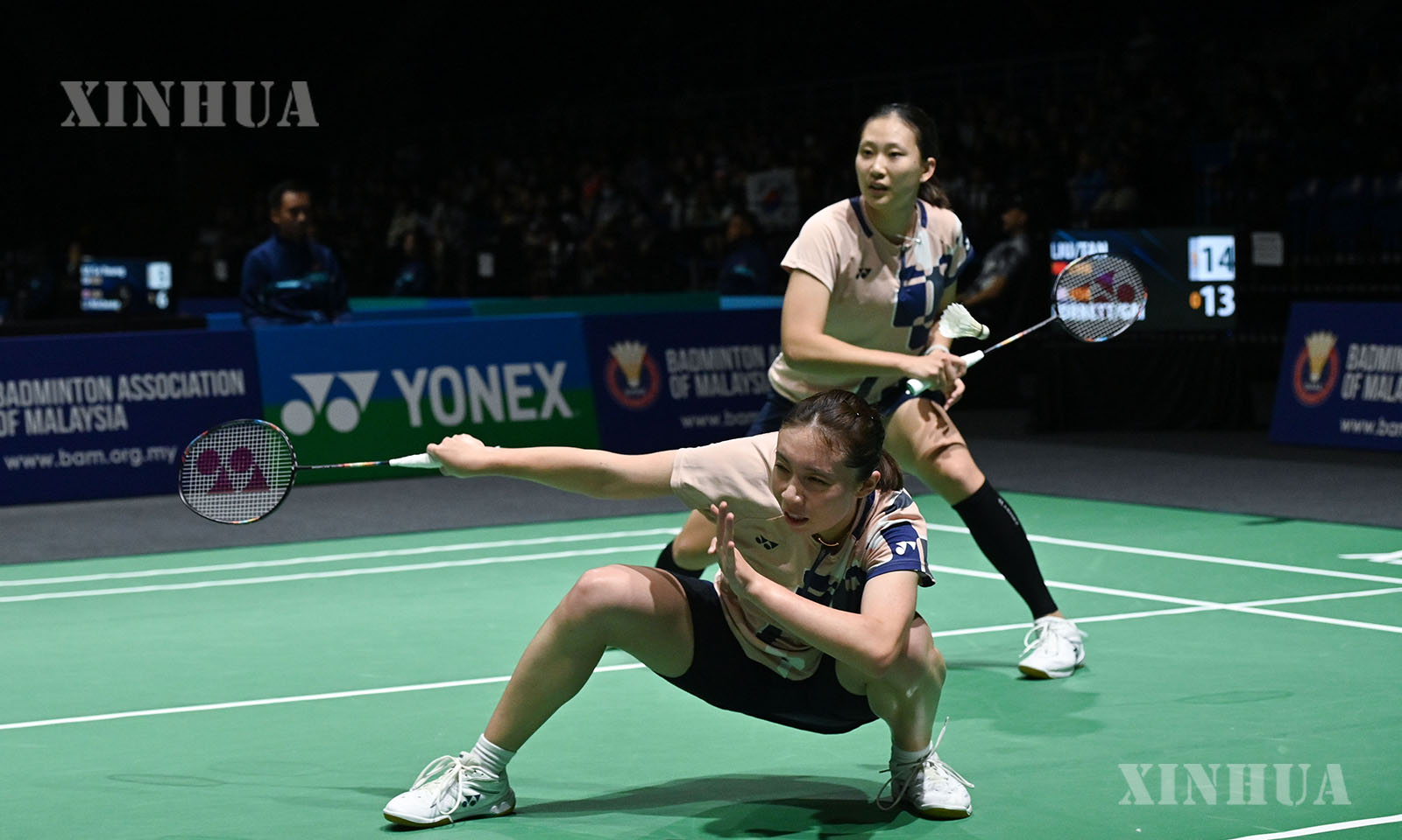 Liu Shengshu/Tan Ning (R) of China react during the women’s doubles round of 16 match against Hirokami Rui/Hobara Sayaka of Japan at the Malaysia Open 2026 badminton tournament in Kuala Lumpur, Malaysia, Jan. 8, 2026. (Xinhua/Cheng Yiheng)