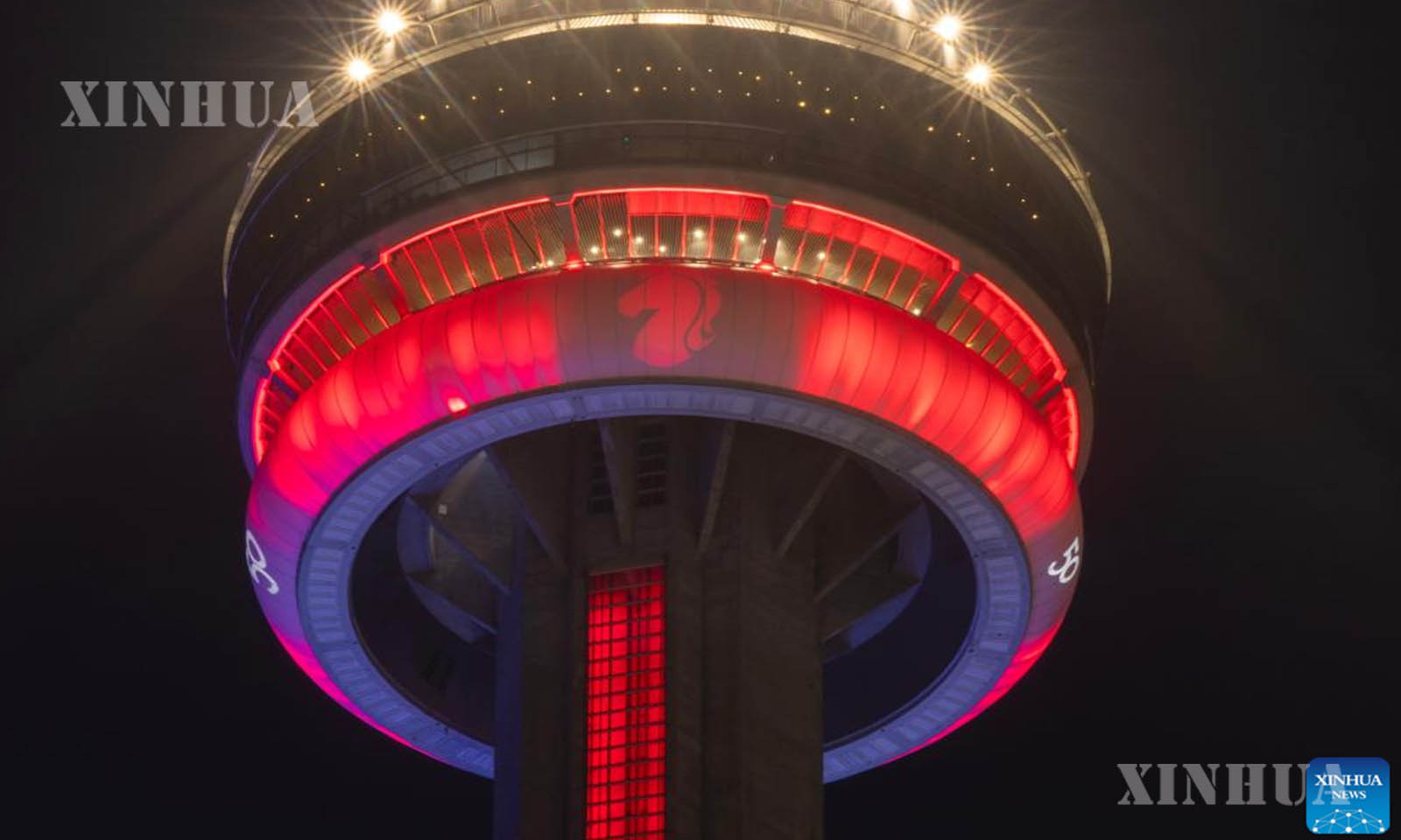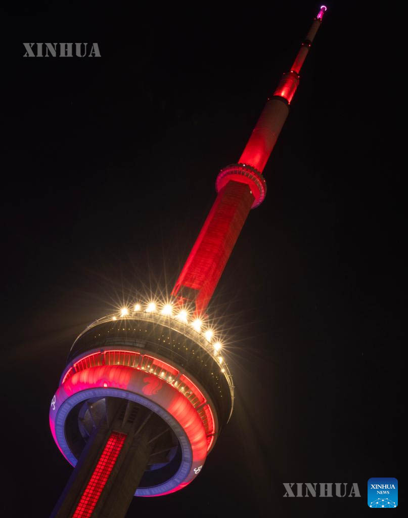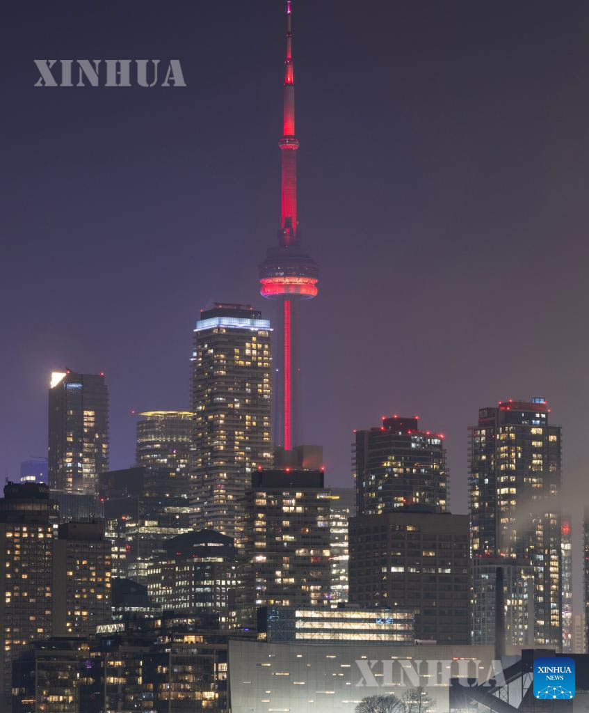 ကနေဒါနိုင်ငံ တိုရွန်တိုမြို့တွင် တရုတ်နှစ်သစ်ကူးကို ဆင်နွှဲသောအားဖြင့် ကနေဒါအမျိုးသားမျှော်စင်ကို အနီရောင်မီးထွန်း (Xinhua)