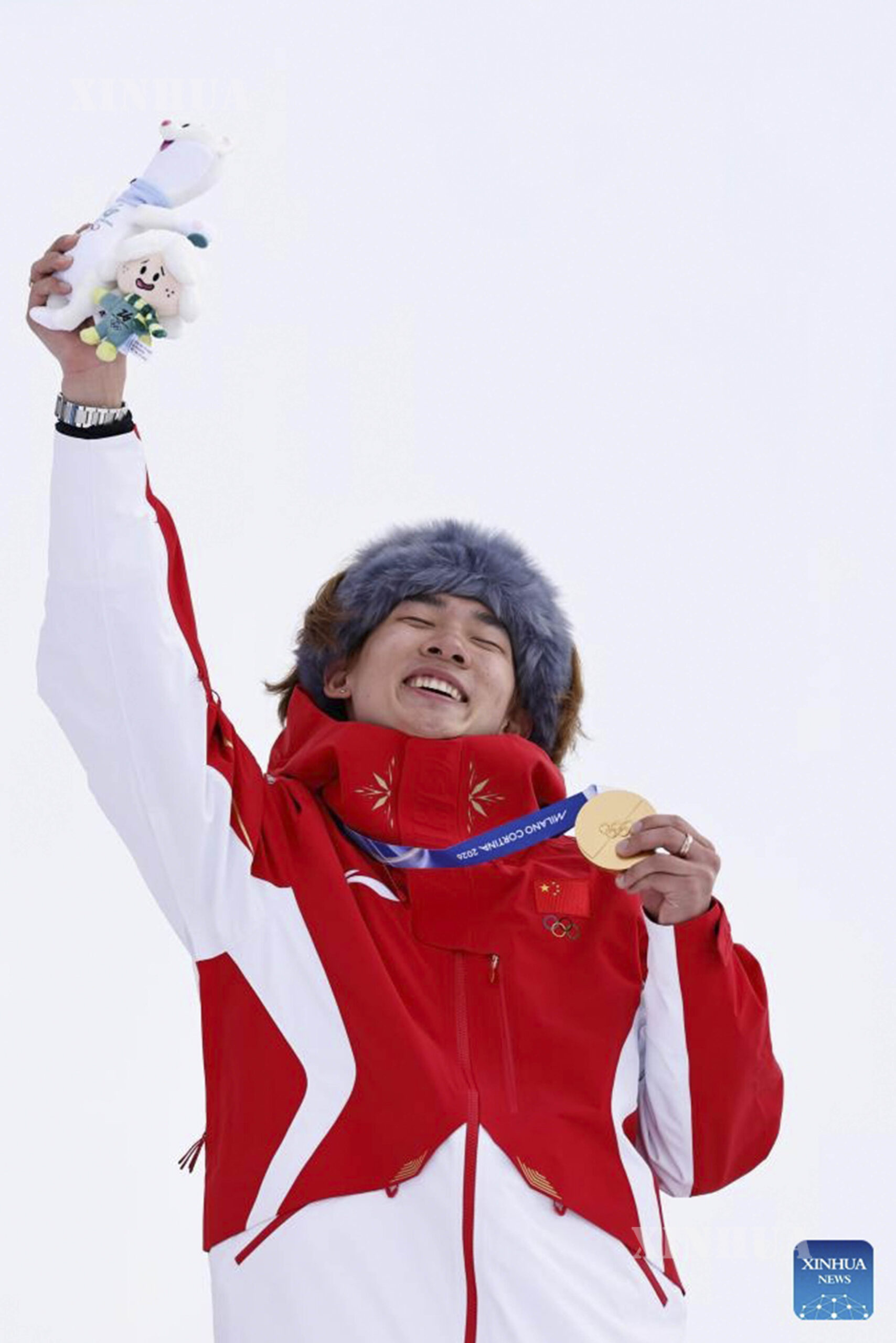 Gold medalist Su Yiming of China reacts during the awarding ceremony for the snowboard men’s slopestyle at the Milan-Cortina 2026 Olympic Winter Games in Livigno, Italy, Feb. 18, 2026. (Xinhua/Wang Peng)