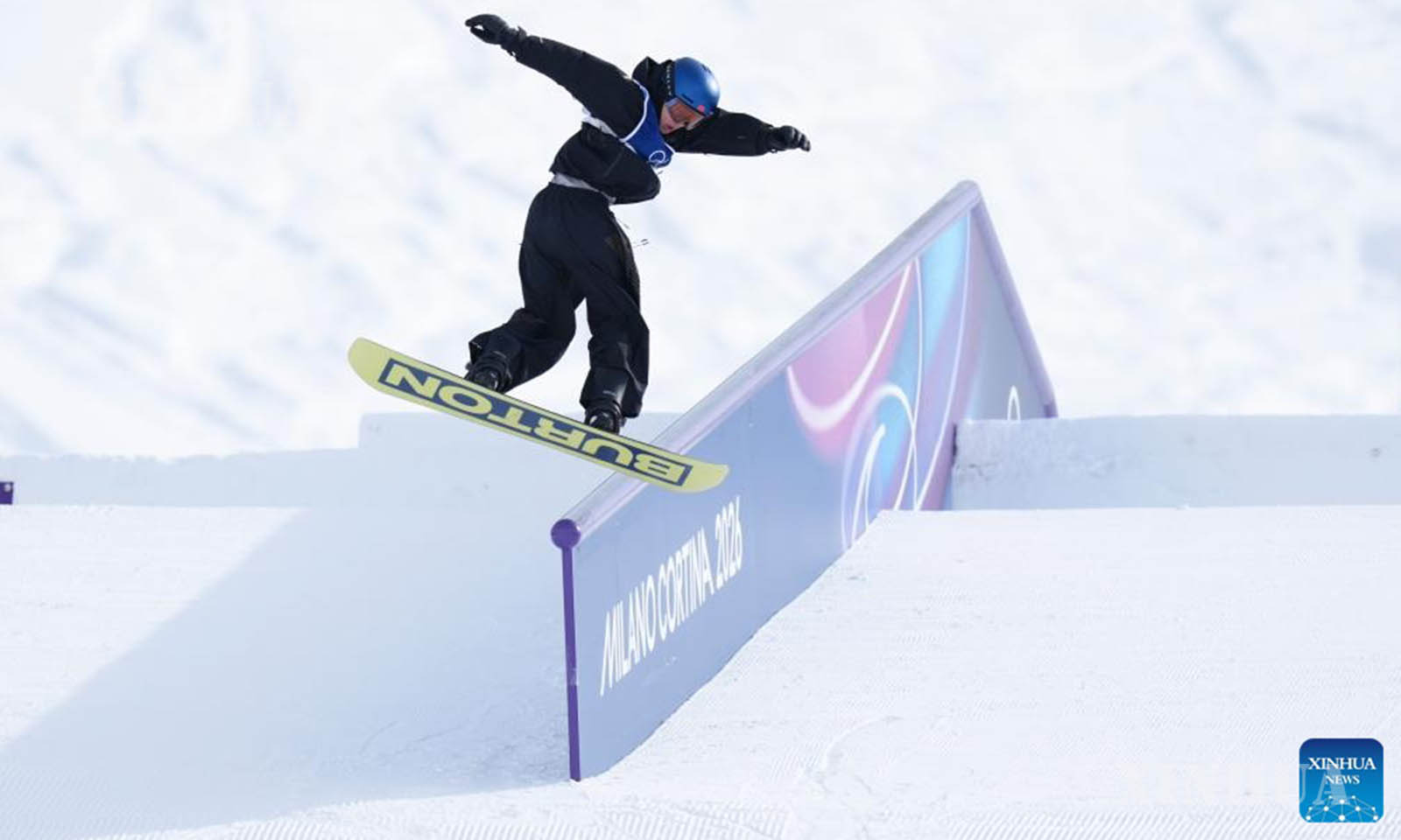 Su Yiming of China competes during the snowboard men’s snowboard slopestyle final at the Milan-Cortina 2026 Olympic Winter Games in Livigno, Italy, Feb. 18, 2026. (Xinhua/Wang Peng)