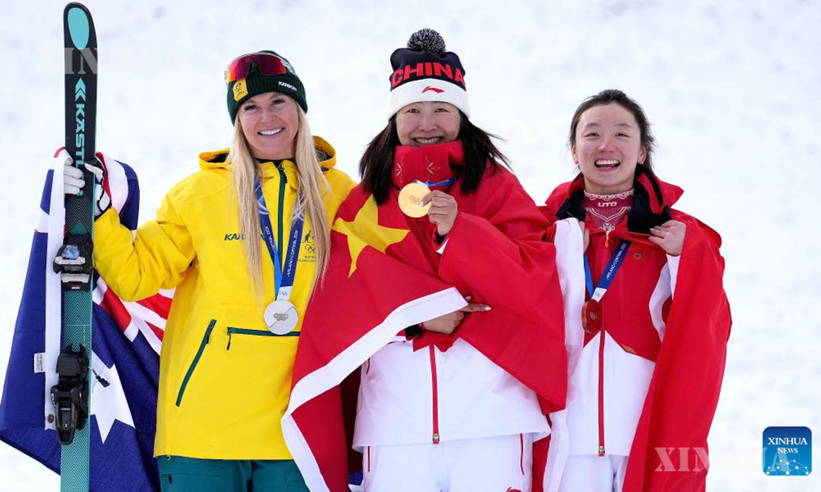 အီတလီနိုင်ငံ လီဗစ်နိုမြို့တွင် ကျင်းပသည့် ၂၀၂၆ ခုနှစ် မီလန်-ကော်တီနာ ဆောင်းရာသီအိုလံပစ်အားကစားပြိုင်ပွဲ၌ Freestyle အမျိုးသမီး လေပေါ်ဝဲနှင်းလျှောစီးပြိုင်ပွဲအတွက် ဆုပေးပွဲအတွင်း ရွှေတံဆိပ်ဆုရရှိသူ တရုတ်နိုင်ငံမှ ရွှီမုန့်ထောင် (အလယ်)၊ ငွေတံဆိပ်ဆုရရှိသူ ဩစတြေးလျနိုင်ငံမှ ဒန်နီယယ်လ်စကော့ (ဝဲဘက်) နှင့် ကြေးတံဆိပ်ဆုရရှိသူ တရုတ်နိုင်ငံမှ Shao Qi တို့ကို ၂၀၂၆ ခုနှစ် ဖေဖော်ဝါရီ ၁၈ ရက်က တွေ့ရစဉ် (ဆင်ဟွာ)