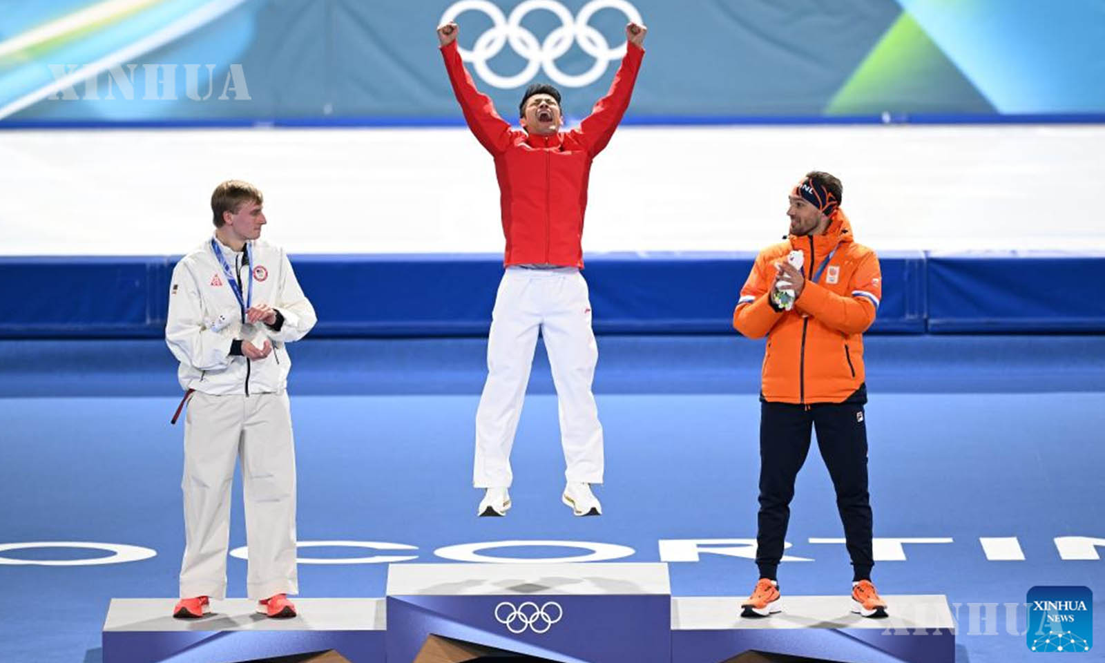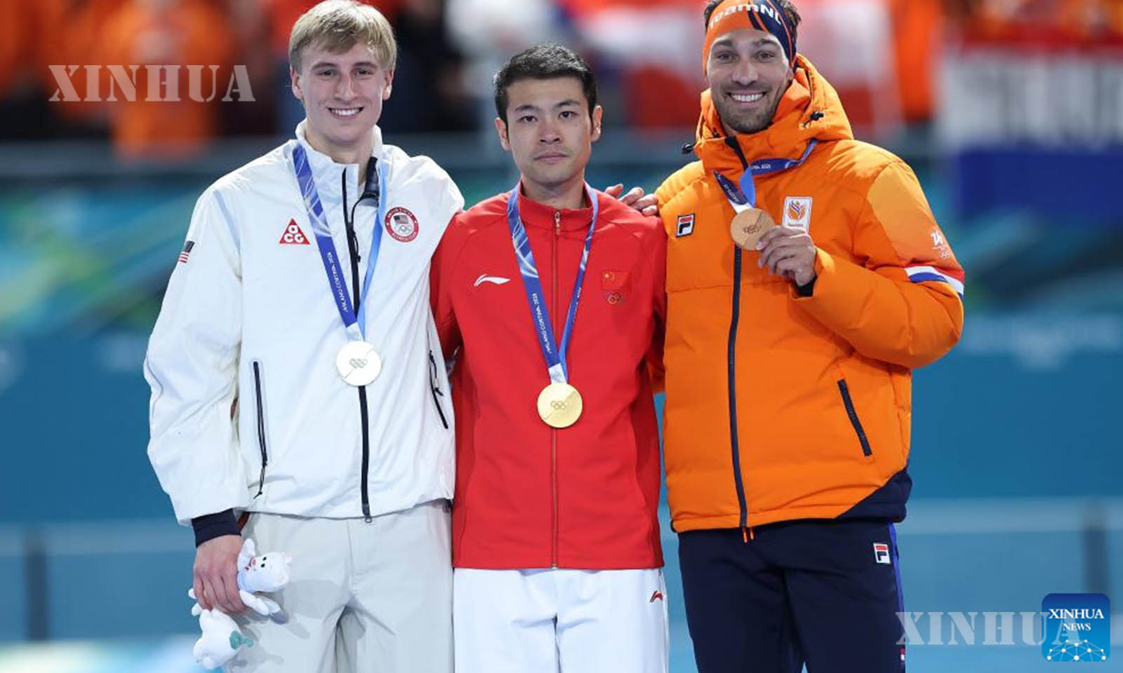 အီတလီနိုင်ငံ မီလန်မြို့၌ ကျင်းပသည့် ၂၀၂၆ ခုနှစ် မီလန်-ကော်တီနာ အိုလံပစ်ဆောင်းရာသီအားကစားပြိုင်ပွဲ၌ အမျိုးသား မီတာ ၁,၅၀၀ အမြန်နှုန်းစကိတ်စီးပြိုင်ပွဲ၏ ဆုပေးပွဲအတွင်း အမှတ်တရဓာတ်ပုံရိုက်နေသည့် ရွှေတံဆိပ်ဆုရရှိသူ တရုတ်နိုင်ငံမှ Ning Zhongyan (အလယ်)၊ ငွေတံဆိပ်ဆုရရှိသူ အမေရိကန်နိုင်ငံမှ ဂျော်ဒန်စတောလ်ဇ် (ဝဲ) နှင့် ကြေးတံဆိပ်ဆုရရှိသူ နယ်သာလန်နိုင်ငံမှ Kjeld Nuis တို့ကို ၂၀၂၆ ခုနှစ် ဖေဖော်ဝါရီ ၁၉ ရက်က တွေ့ရစဉ် (ဆင်ဟွာ)