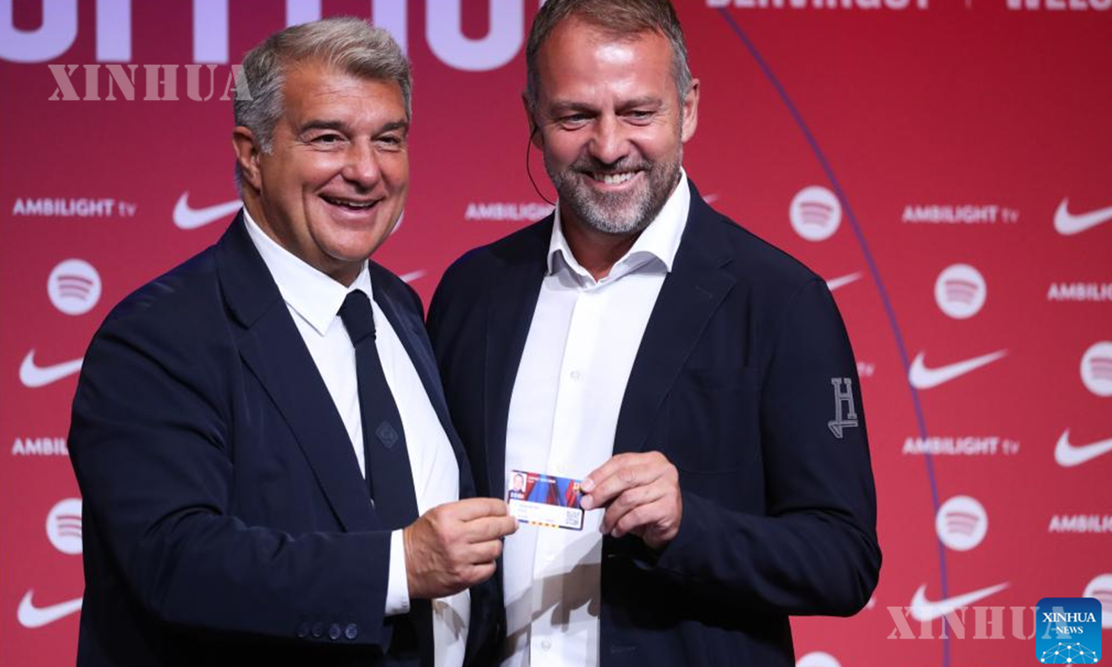 FC Barcelona’s new head coach Hansi Flick (R) poses with FC Barcelona president Joan Laporta during an official presentation event of the new coach in Barcelona, Spain, on July 25, 2024. (Photo by Joan Gosa/Xinhua)