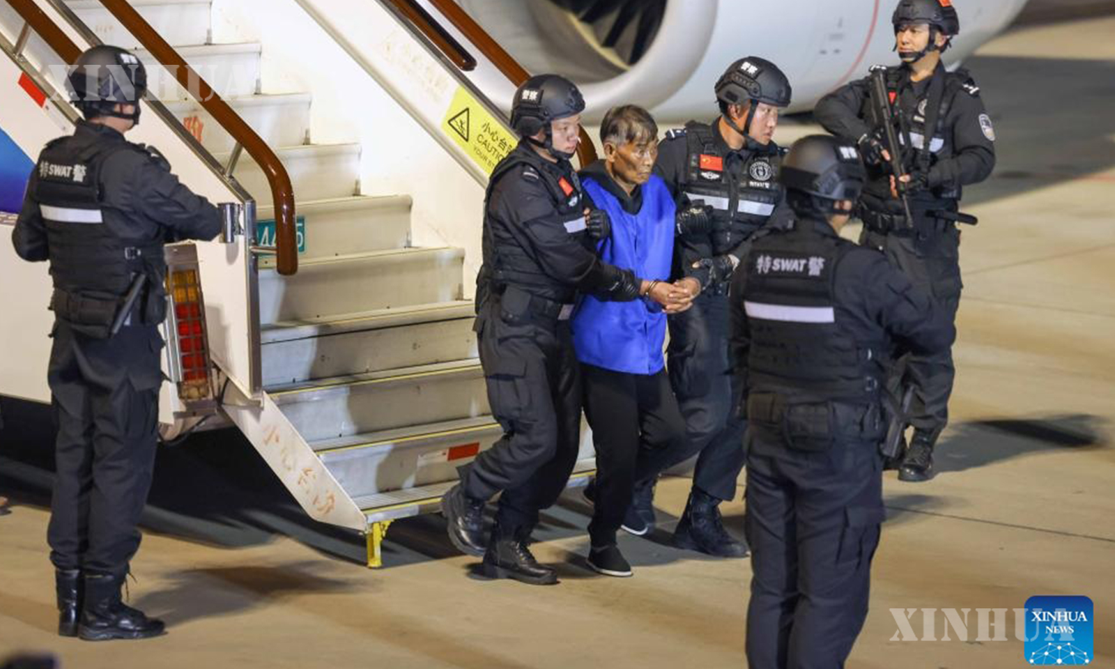 Photo: Criminal suspect Bai Suo Cheng is escorted by Chinese police officers at the Kunming Changshui International Airport in Kunming, southwest China’s Yunnan Province, Jan. 30, 2024. (Xinhua/Yin Gang)