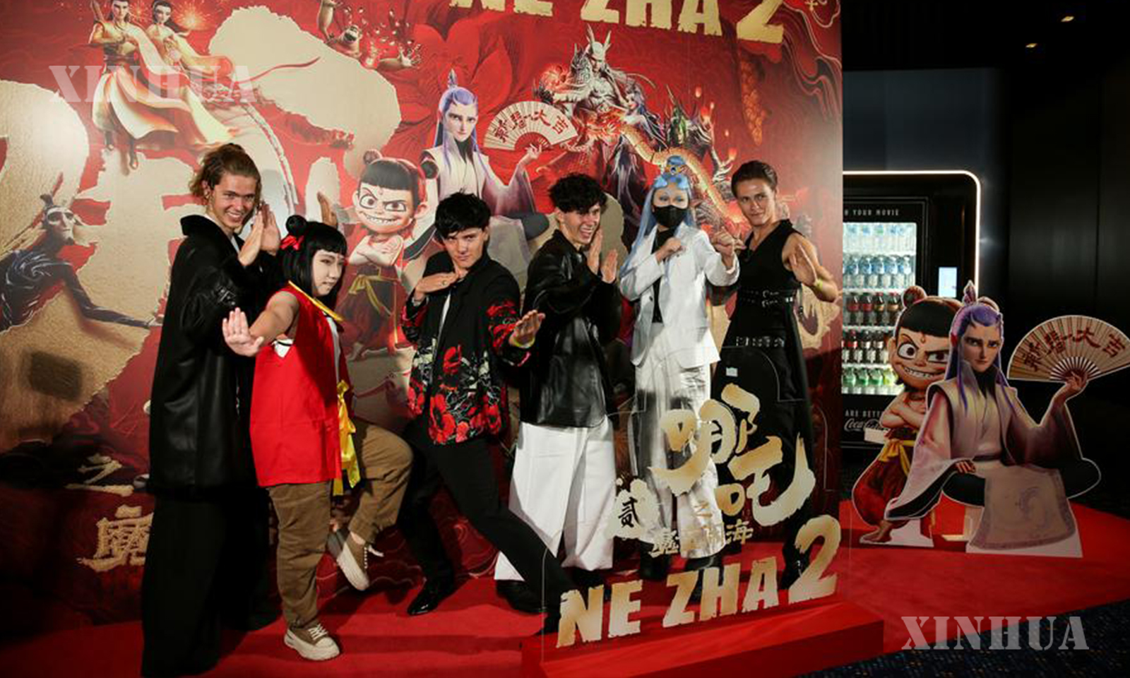 Audience pose for photos in front of the poster of the Chinese animated film “Ne Zha 2” at IMAX Sydney in Sydney, Australia, Feb. 11, 2025. (Xinhua/Ma Ping)
