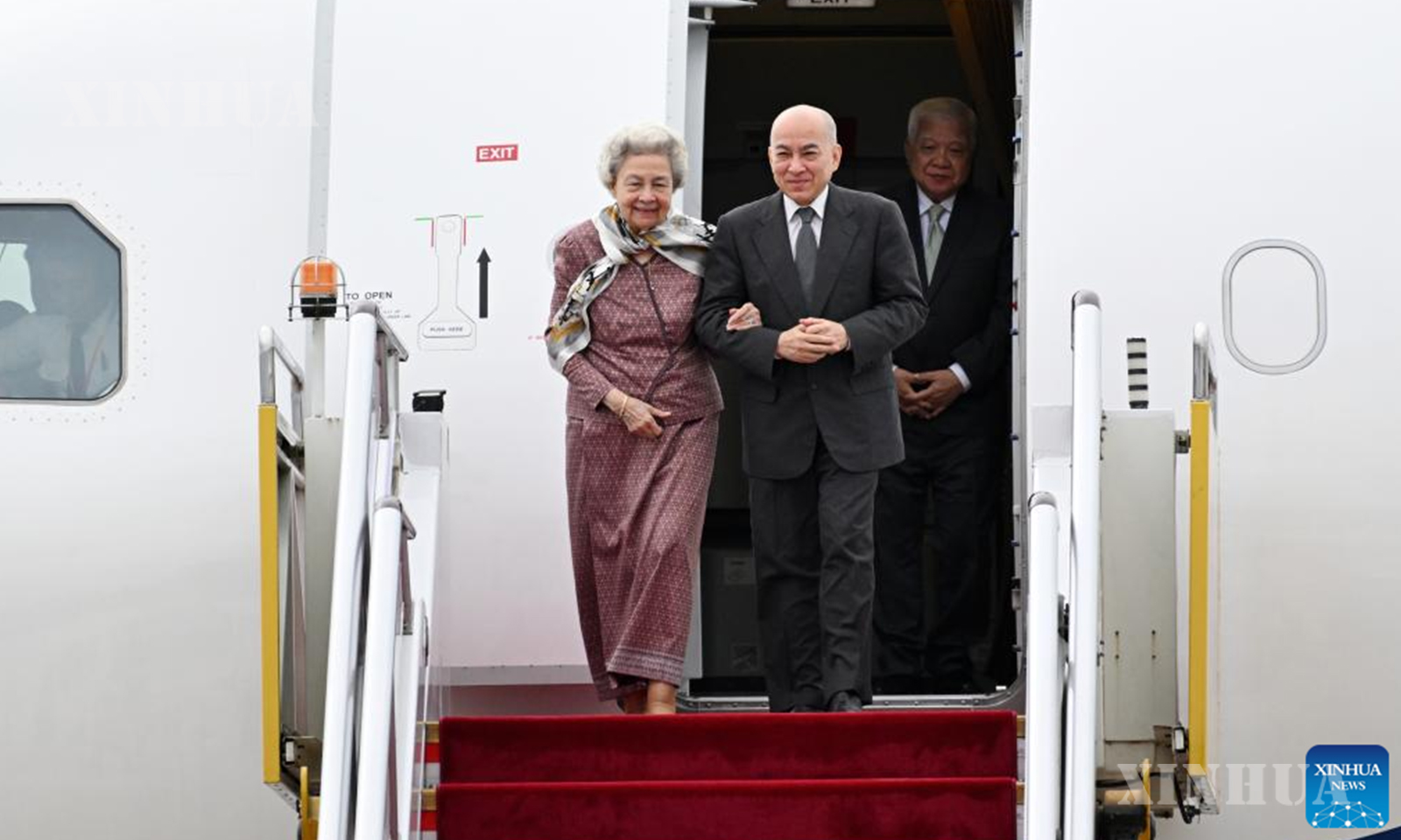 တရုတ်နိုင်ငံ မြို့တော်ပေကျင်းသို့ လေယာဉ်ဖြင့် ရောက်ရှိလာကြသည့် ကမ္ဘောဒီးယားနိုင်ငံဘုရင် နိုရိုဒွန် သီဟာမိုနီနှင့် ဘုရင့်မယ်တော် နိုရိုဒွန် မိုနိ သီဟာနုတို့ကို ၂၀၂၅ ခုနှစ် ဩဂုတ် ၂၃ ရက်က တွေ့ရစဉ် (ဆင်ဟွာ)