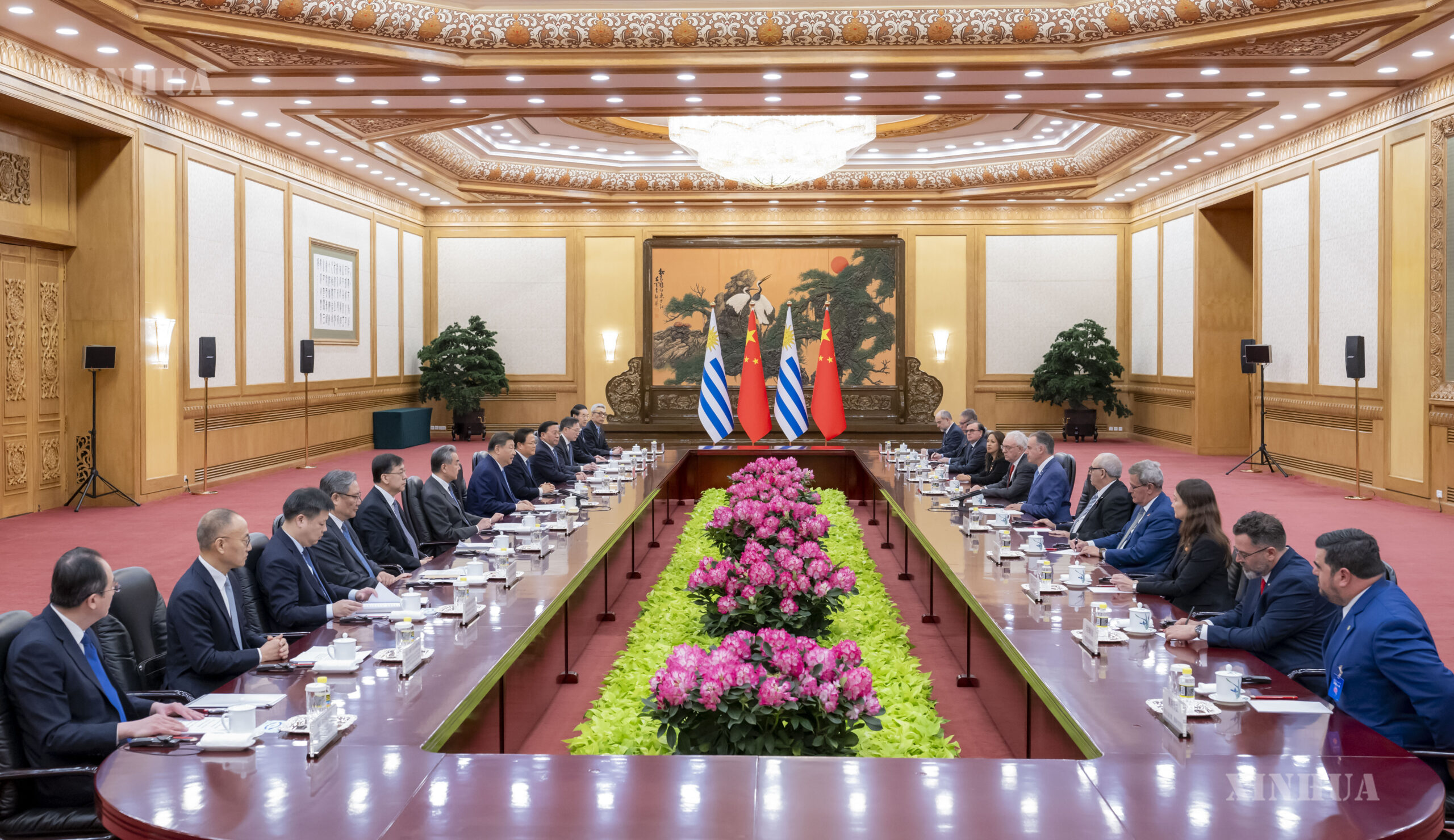 တရုတ်နိုင်ငံ သမ္မတ ရှီကျင့်ဖိန်နှင့် နိုင်ငံတော်ခရီးစဉ်အဖြစ် တရုတ်နိုင်ငံသို့ ရောက်ရှိနေသော ဥရုဂွေးနိုင်ငံ သမ္မတ Yamandu Orsi တို့ တရုတ်နိုင်ငံ မြို့တော် ပေကျင်းရှိ ပြည်သူ့ခန်းမဆောင်တွင် ၂၀၂၆ ခုနှစ် ဖေဖော်ဝါရီ ၃ ရက်က တွေ့ဆုံဆွေးနွေးနေစဉ် (ဆင်ဟွာ)