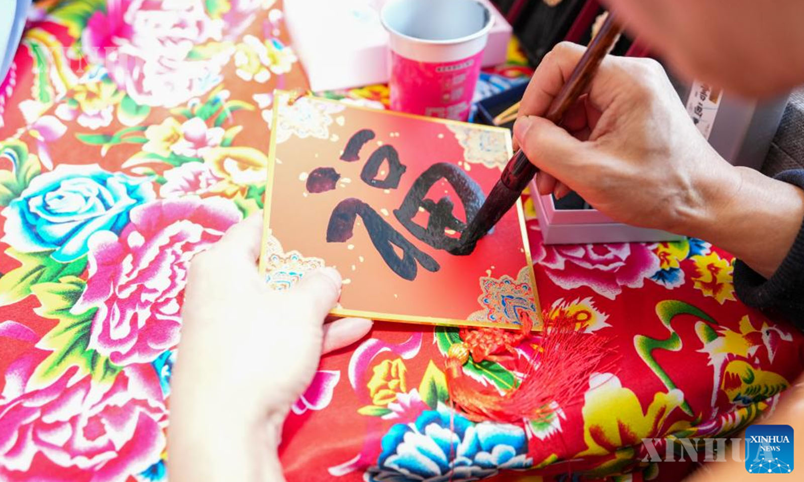 တရုတ်နိုင်ငံ အရှေ့မြောက်ပိုင်းရှိ ဟေးလုံကျန်းပြည်နယ်တွင် ပြုလုပ်သည့် “ရထားထဲမှ ဈေးပွဲတော်” ၌ (“ကံကြမ္မာ” ဟု အဓိပ္ပာယ်ရသည့်) တရုတ်စာလုံး “Fu” အား ရထားအမှုထမ်းတစ်ဦးက ရေးသားနေပုံကို ၂၀၂၆ ခုနှစ် ဖေဖော်ဝါရီ ၄ ရက်က တွေ့ရစဉ် (ဆင်ဟွာ)