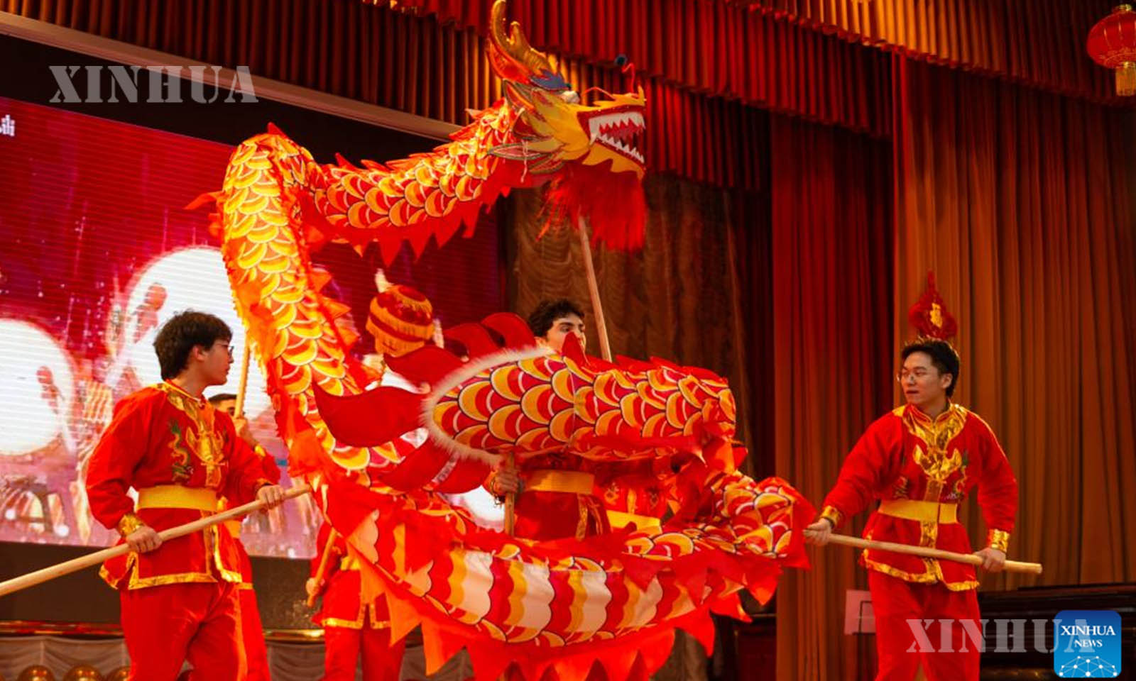 လာမည့်တရုတ်နှစ်သစ်ကူးအား ဆင်နွှဲသောအားဖြင့် အဇာဘိုင်ဂျန်နိုင်ငံ မြို့တော်ဘာကူရှိ Baku State University တက္ကသိုလ်၌ ကျင်းပသည့် ပွဲအခမ်းအနားအတွင်း နဂါးအက ဖျော်ဖြေတင်ဆက်ပုံကို တွေ့ရစဉ် (ဆင်ဟွာ)