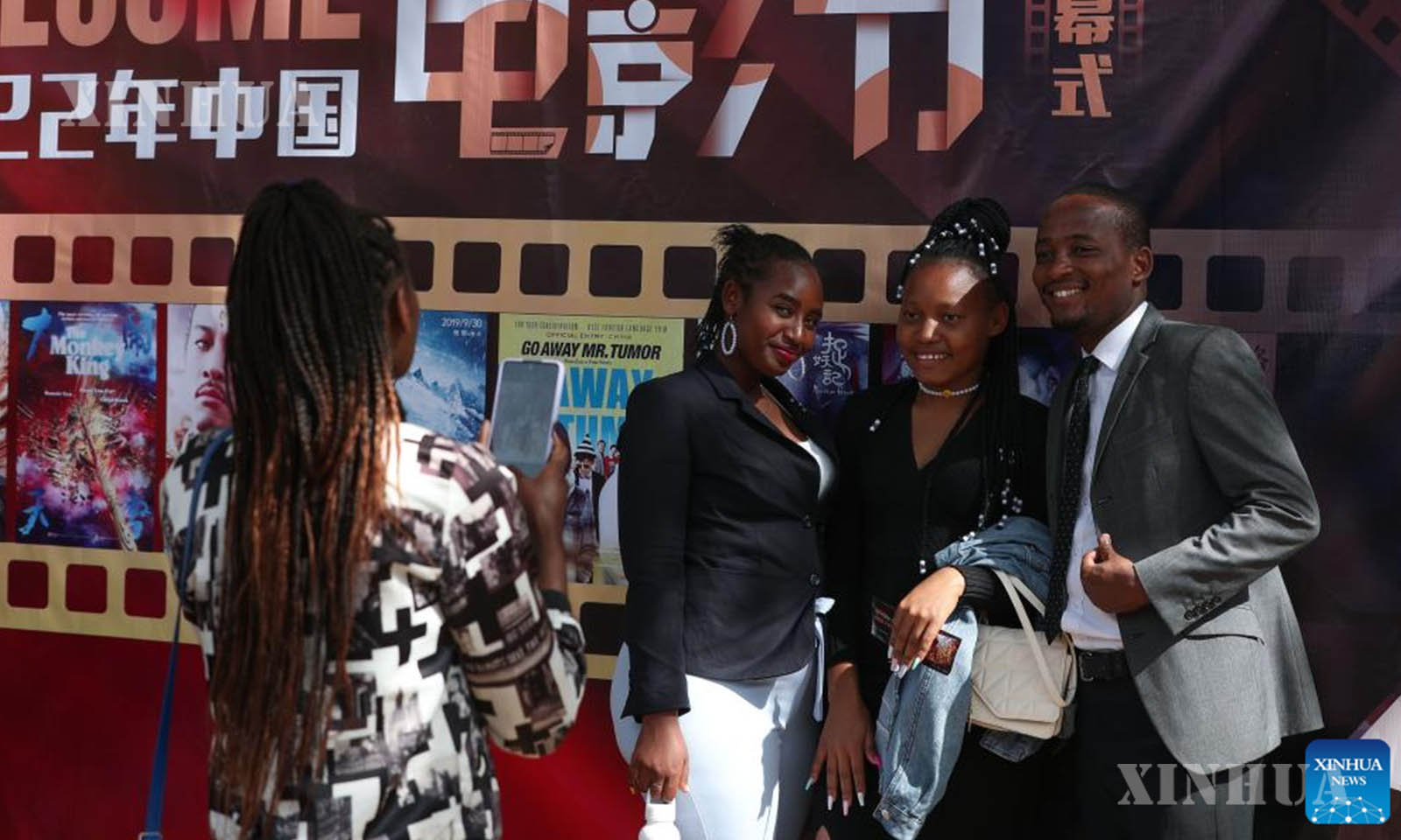 Visitors pose for a photo in front of a poster of the 2022 Chinese film festival in Nairobi, Kenya, Oct. 27, 2022. (Xinhua/Long Lei)
