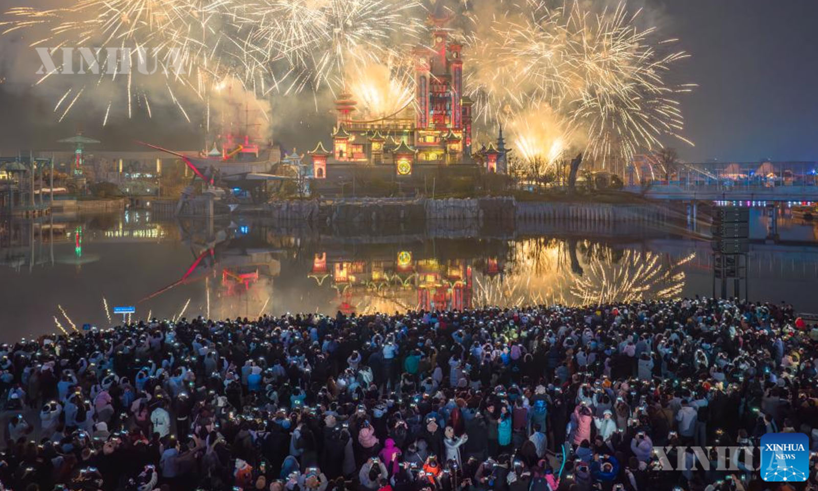 တရုတ်နိုင်ငံ အရှေ့ပိုင်း ဆန်းတုန်းပြည်နယ် Laoling မြို့ရှိ ရုပ်ရှင်ရိုက်ကူးရေးနှင့် ယဉ်ကျေးမှုဆိုင်ရာခရီးသွားလုပ်ငန်းအခြေစိုက် Laoling World Studios စတူဒီယို၌ ဖျော်ဖြေပွဲကြည့်ရှုနေကြသည့် ခရီးသွားဧည့်သည်များကို ၂၀၂၆ ခုနှစ် ဇန်နဝါရီ ၁ ရက်က တွေ့ရစဉ် (ဆင်ဟွာ)