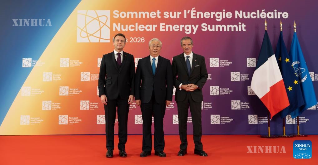 တရုတ်နိုင်ငံ သမ္မတ ရှီကျင့်ဖိန်၏ အထူးကိုယ်စားလှယ်၊ တရုတ်ကွန်မြူနစ်ပါတီ ဗဟိုကော်မတီ နိုင်ငံရေးဗျူရိုအဖွဲ့ဝင်နှင့် တရုတ်နိုင်ငံ ဒုတိယဝန်ကြီးချုပ်ဖြစ်သူ ကျန်းကော်ချင်းနှင့် ပြင်သစ်နိုင်ငံ သမ္မတ အီမန်နျူရယ် မက်ခရွန် (ဝဲ)၊ နိုင်ငံတကာ အဏုမြူစွမ်းအင်အေဂျင်စီ ညွှန်ကြားရေးမှူးချုပ် ရာဖေး ဂရော့ဆီတို့ ပြင်သစ်နိုင်ငံ ပဲရစ်မြို့တွင် ကျင်းပသည့် ဒုတိယအကြိမ် နျူကလီးယားစွမ်းအင် ညီလာခံ တက်ရောက်စဉ် အဖွဲ့လိုက်ဓာတ်ပုံ ရိုက်ကူးနေသည်ကို ၂၀၂၆ ခုနှစ် မတ် ၁၀ ရက်က တွေ့ရစဉ် (ဆင်ဟွာ)