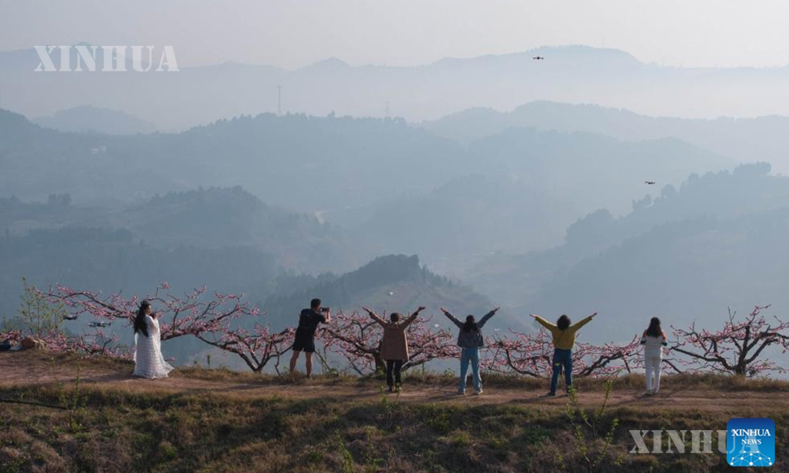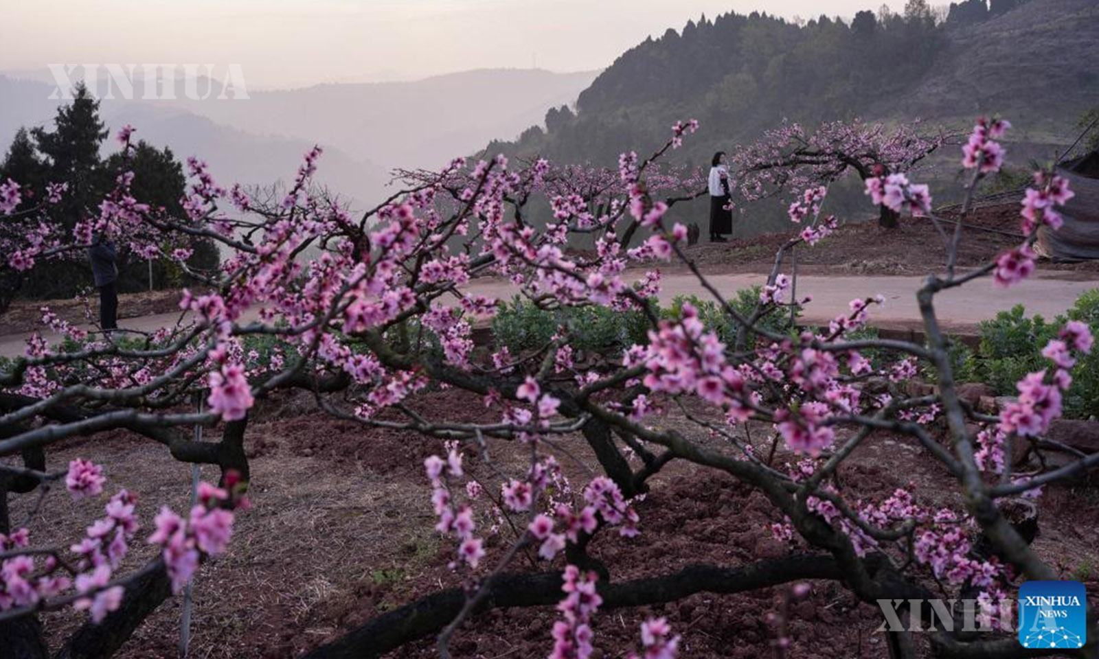 တရုတ်နိုင်ငံ အနောက်တောင်ပိုင်း စီချွမ်းပြည်နယ် ချိန်တူးမြို့ရှိ လုန်ချွမ်တောင်ပေါ်တွင် ဖူးပွင့်နေသော မက်မွန်ပန်းလေးများကို ကြည့်ရှုခံစားနေသည့် ခရီးသွားဧည့်သည်များအား ၂၀၂၆ ခုနှစ် မတ် ၁၁ ရက်က တွေ့ရစဉ် (ဆင်ဟွာ)