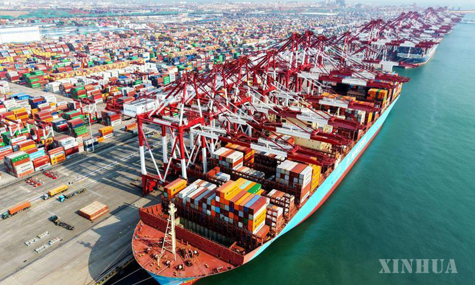 တရုတ်နိုင်ငံ အရှေ့ပိုင်း ဆန်းတုန်းပြည်နယ် ချင်းသောင်မြို့ရှိ ချင်းသောင်ဆိပ်ကမ်းအား ၂၀၂၆ ခုနှစ် မတ် ၁၀ ရက်က ဒရုန်းဖြင့်ရိုက်ကူးထားသော ကောင်းကင်ဓာတ်ပုံ၌ တွေ့ရစဉ် (ဆင်ဟွာ)