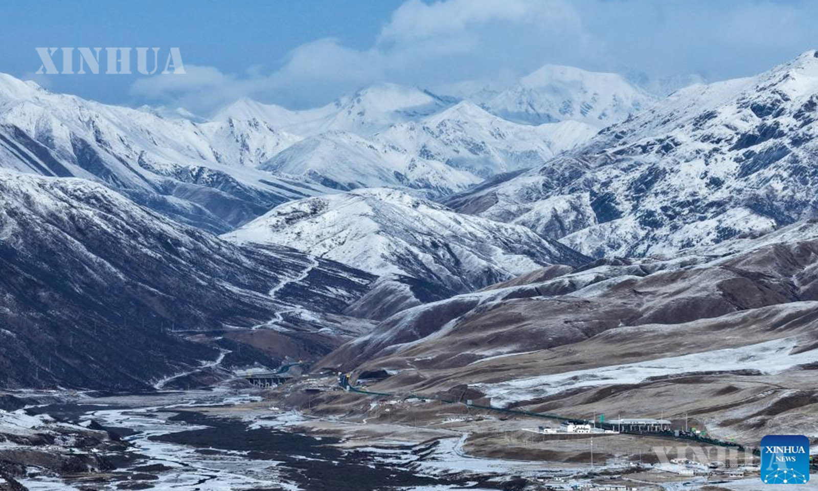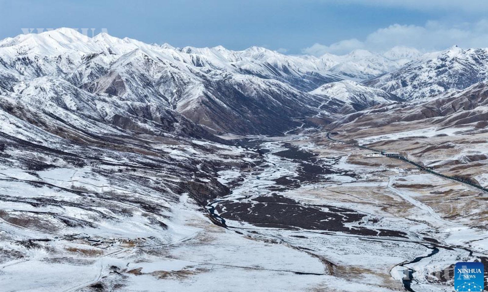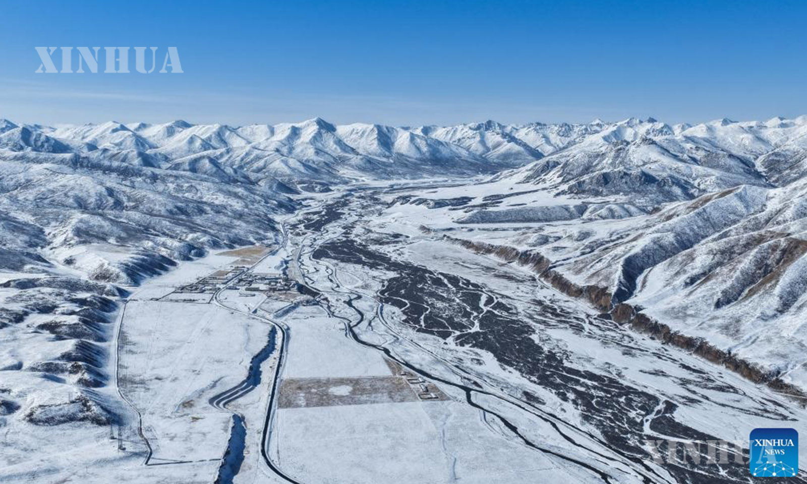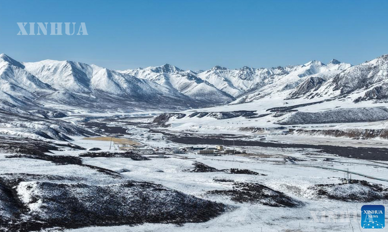 တရုတ်နိုင်ငံ အ‌နောက်မြောက်ပိုင်း ချင်းဟိုင်ပြည်နယ် ကော်လော့ ရှီးဇန့်လူမျိုး ကိုယ်ပိုင်အုပ်ချုပ်ခွင့်ရပြည်နယ်ခွဲ မာချင့်ခရိုင်တွင် ကောင်းကင်ပြာအောက်က ဆီးနှင်းလွှမ်းခြုံထားသော တောင်တန်းများမှာ ကုန်းပြင်မြင့်ထက် ခမ်းနားလှပသော မြင်ကွင်းတစ်ရပ် ဖြစ်ပေါ်လျက်ရှိပေသည်။ (Xinhua)