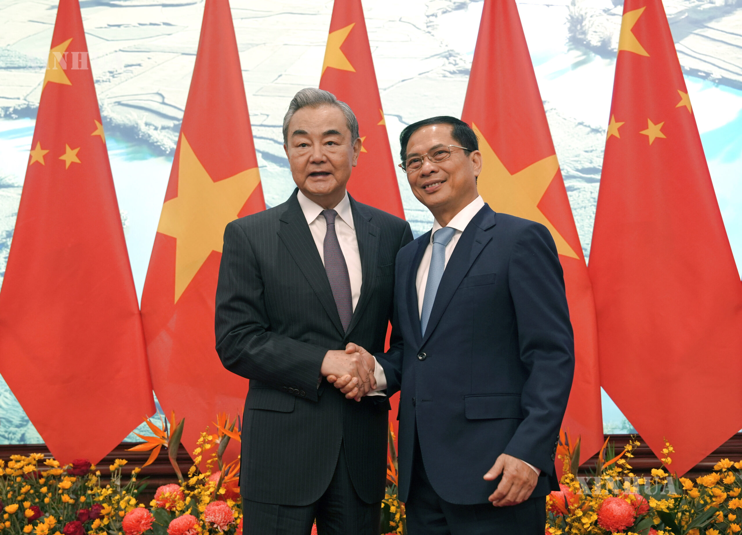တရုတ်ကွန်မြူနစ်ပါတီ ဗဟိုကော်မတီ နိုင်ငံရေးဗျူရိုအဖွဲ့ဝင်၊ တရုတ်နိုင်ငံခြားရေးဝန်ကြီး ဝမ်ရိနှင့် ဗီယက်နမ်နိုင်ငံ ဒုတိယဝန်ကြီးချုပ် Bui Thanh Son တို့ ဗီယက်နမ်နိုင်ငံ ဟနွိုင်းမြို့တွင် တရုတ်-ဗီယက်နမ် နှစ်နိုင်ငံ ပူးပေါင်းဆောင်ရွက်ရေးဆိုင်ရာ ဦးဆောင်ကော်မတီ ၁၇ ကြိမ်မြောက် အစည်းအဝေးအား ပူးတွဲသဘာပတိအဖြစ် ကြီးမှူးကျင်းပနေပုံကို ၂၀၂၆ ခုနှစ် မတ် ၁၇ ရက်က တွေ့ရစဉ် (ဆင်ဟွာ)