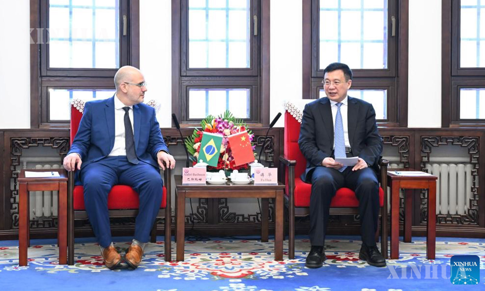 ဆင်ဟွာသတင်းဌာန ဥက္ကဋ္ဌ ဖုဟွာက ဘရာဇီးနိုင်ငံ အသံလွှင့်ကုမ္ပဏီ Empresa Brasil de Comunicação (EBC) ဥက္ကဋ္ဌ André Basbaum အား ၂၀၂၆ ခုနှစ် မတ် ၁၇ ရက်က တရုတ်နိုင်ငံ မြို့တော် ပေကျင်း၌ လက်ခံတွေ့ဆုံစဉ် (ဆင်ဟွာ)
