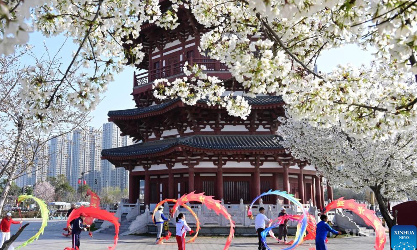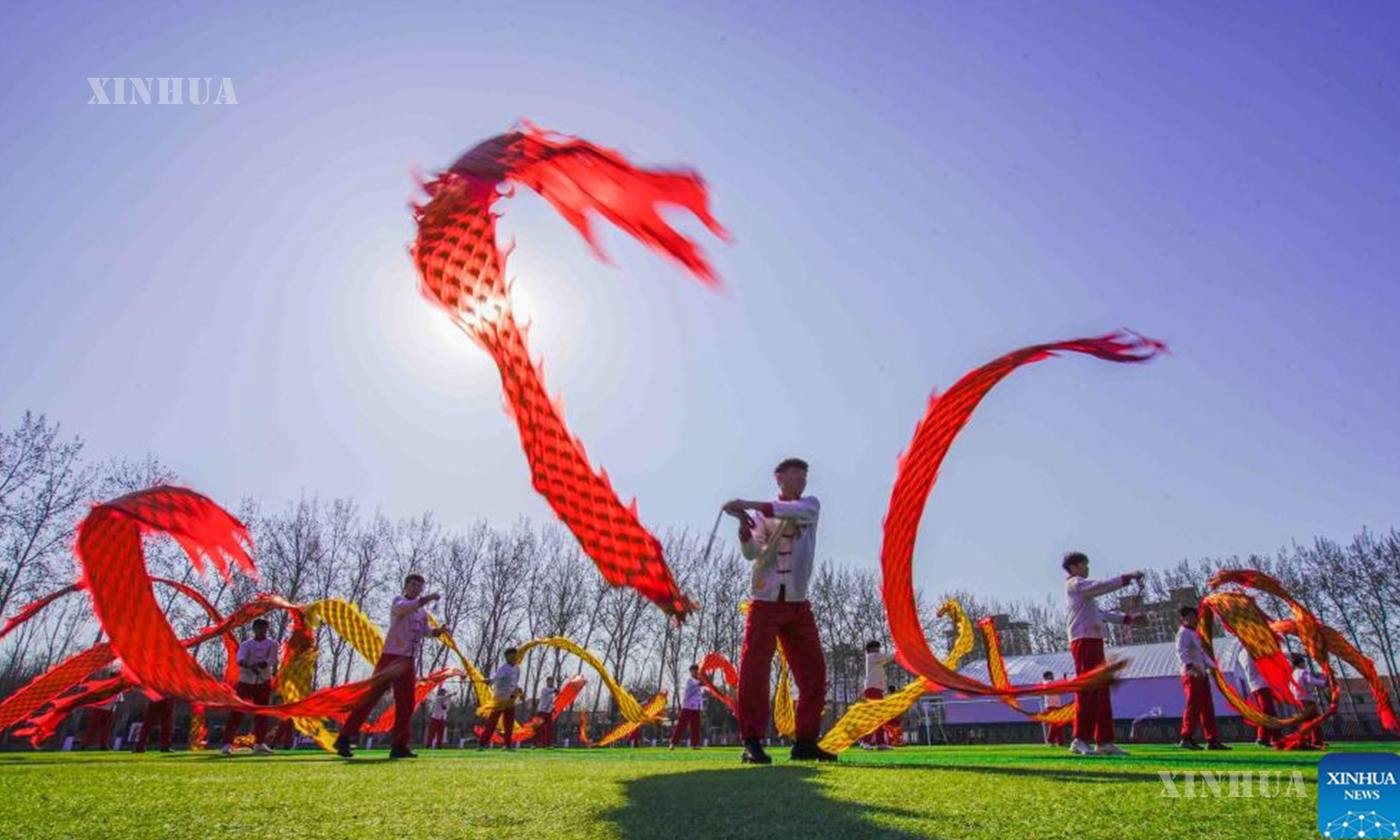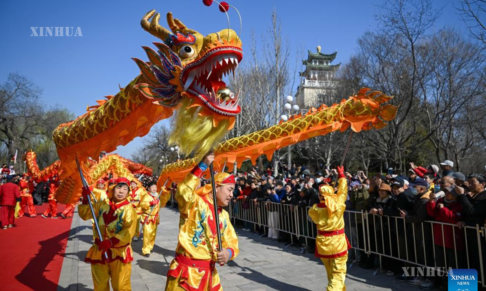 Artists stage a dragon dance performance at a park in north China’s Tianjin, on March 20, 2026. (Xinhua/Sun Fanyue)