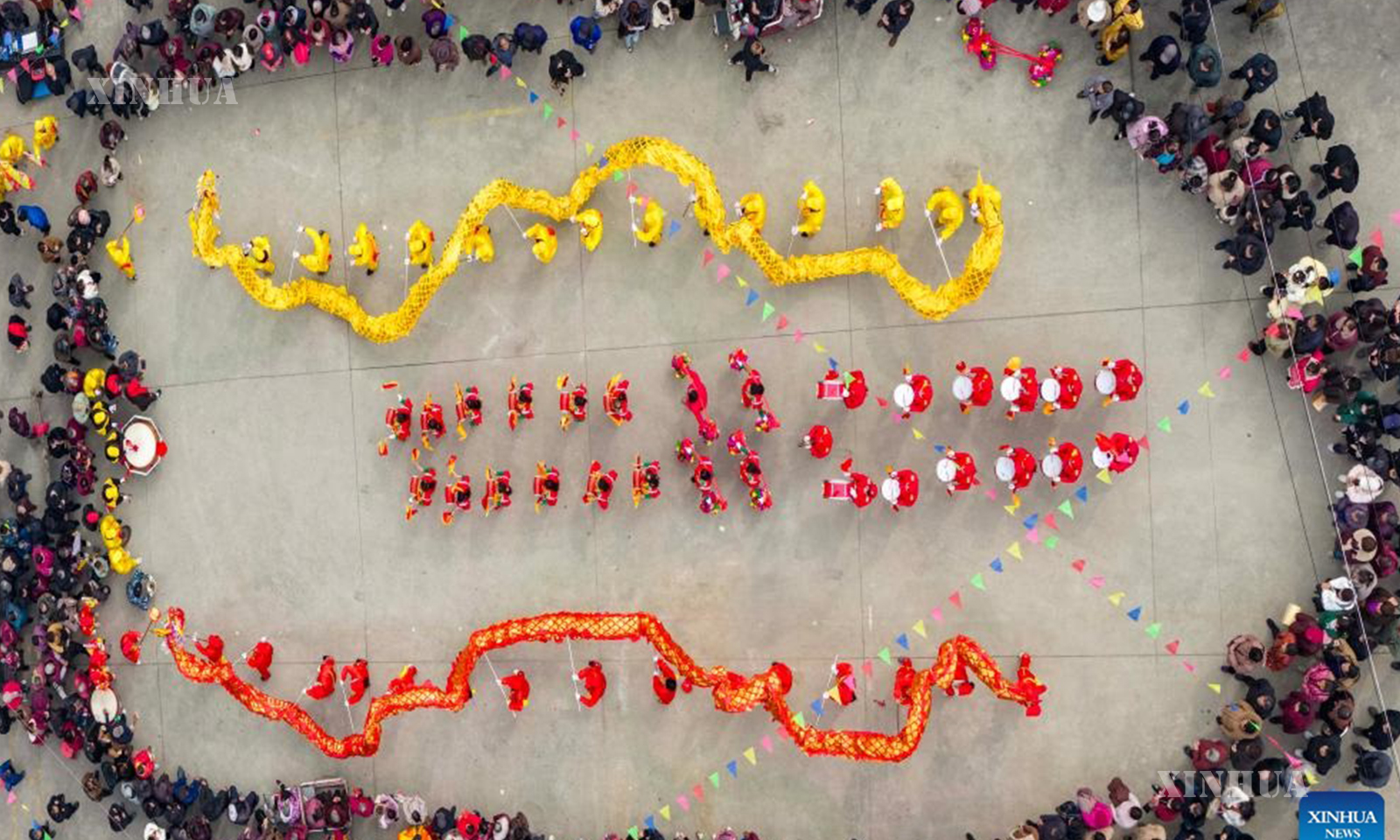 An aerial drone photo taken on March 20, 2026 shows a dragon dance performance during a traditional temple fair in Xiaxi Village of Taizhou, east China’s Jiangsu Province. (Photo by Tang Dehong/Xinhua)